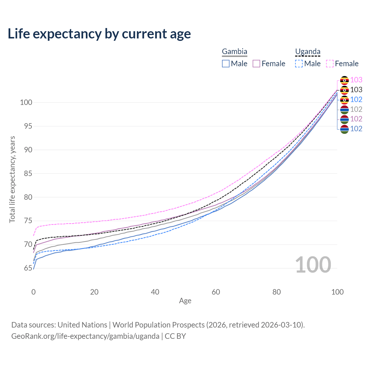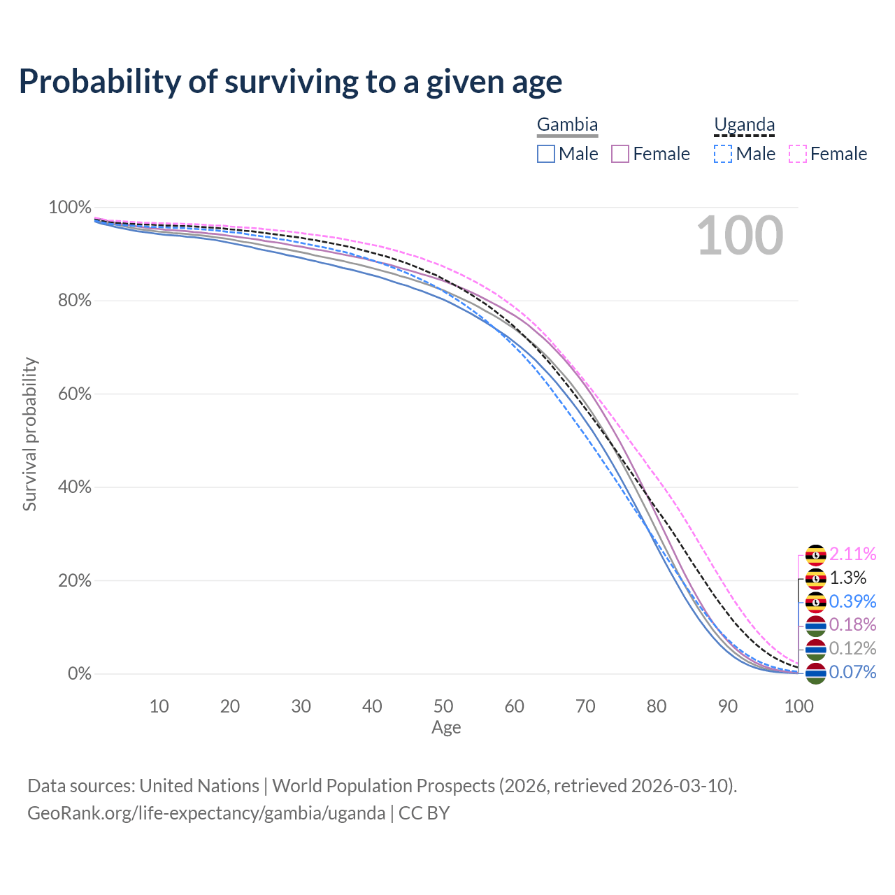 This life expectancy calculator shows the odds of living to 100, 95, 90, and below based on current age for both males and females in the Gambia and Uganda, along with mean and median age of death. The calculations are based on the 2026 life tables (actuarial tables) from the UN World Population Prospects.