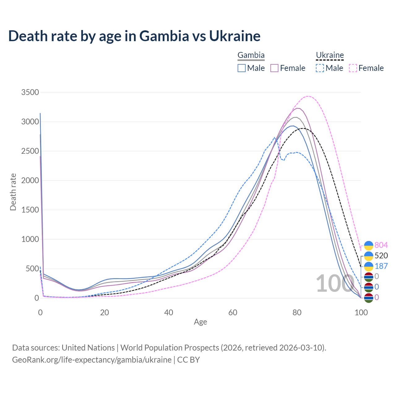 In the Gambia, the most common age of death is 80, compared to 82 in Ukraine. The median age of death is 73.4 in the Gambia and 78 in Ukraine, meaning only half of each cohort is expected to live past that age.