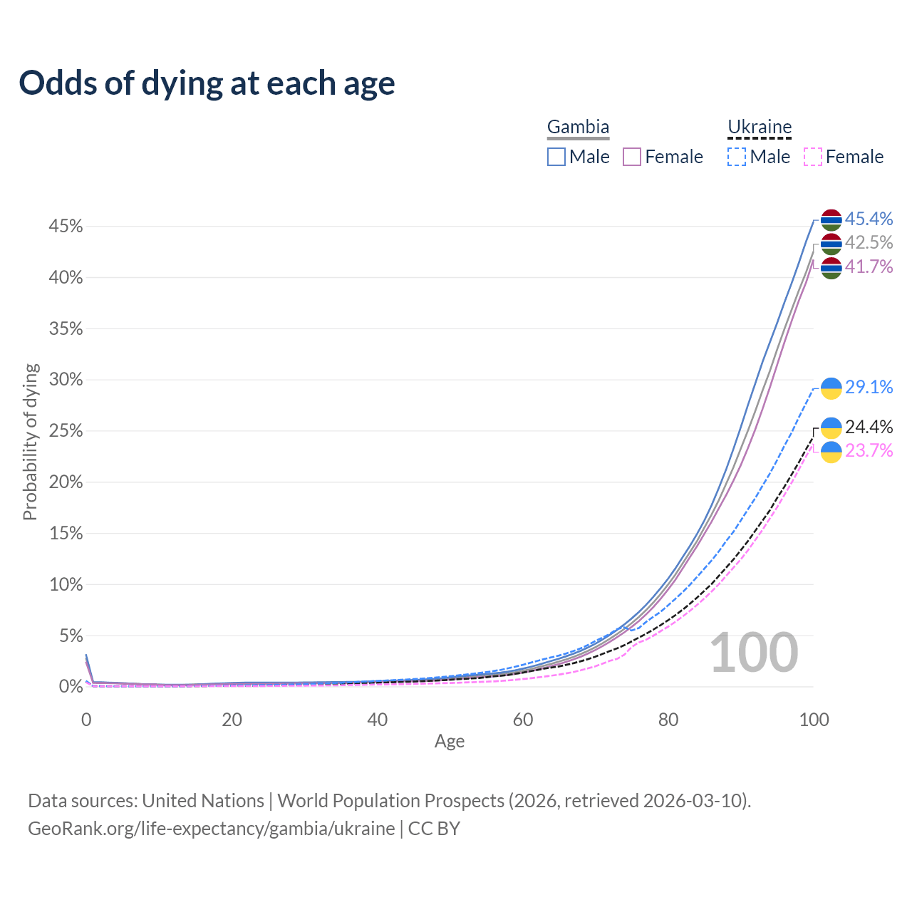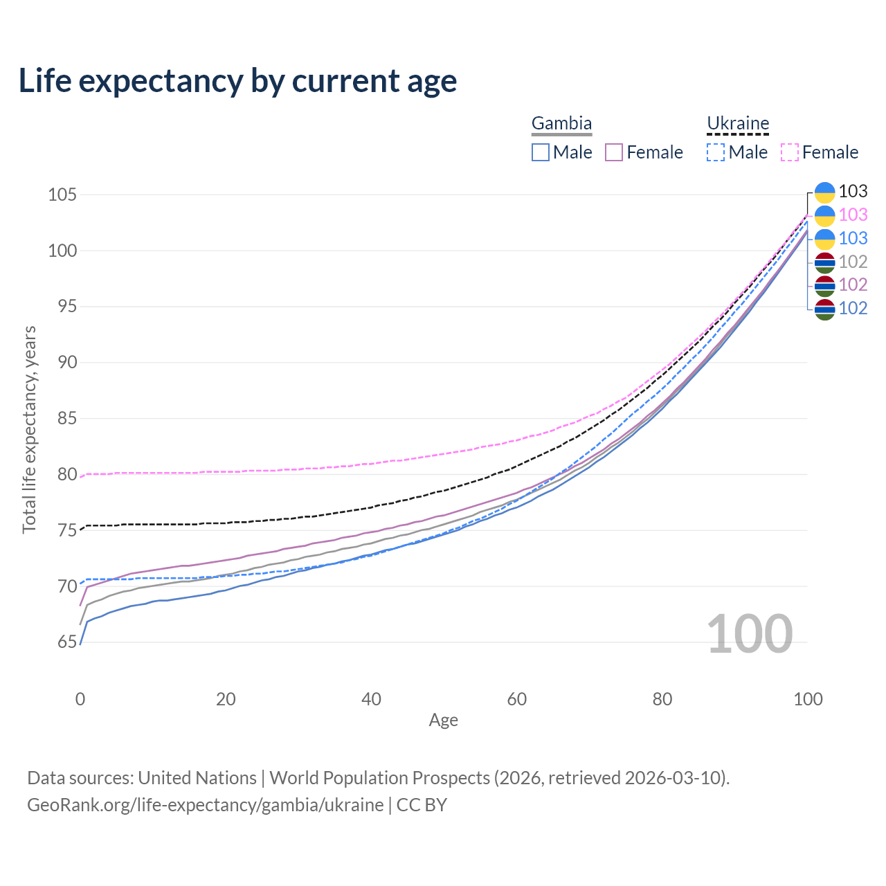 This life expectancy calculator shows the odds of living to 100, 95, 90, and below based on current age for both males and females in the Gambia and Ukraine, along with mean and median age of death. The calculations are based on the 2026 life tables (actuarial tables) from the UN World Population Prospects.
