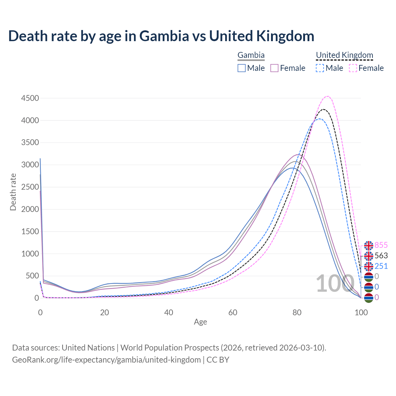 In the Gambia, the most common age of death is 80, compared to 88 in the United Kingdom. The median age of death is 73.4 in the Gambia and 84.9 in the United Kingdom, meaning only half of each cohort is expected to live past that age.