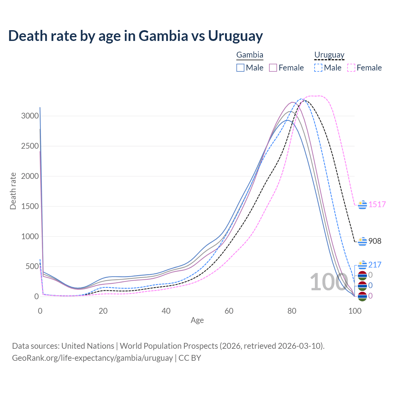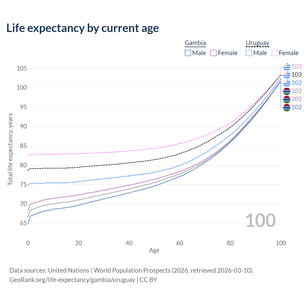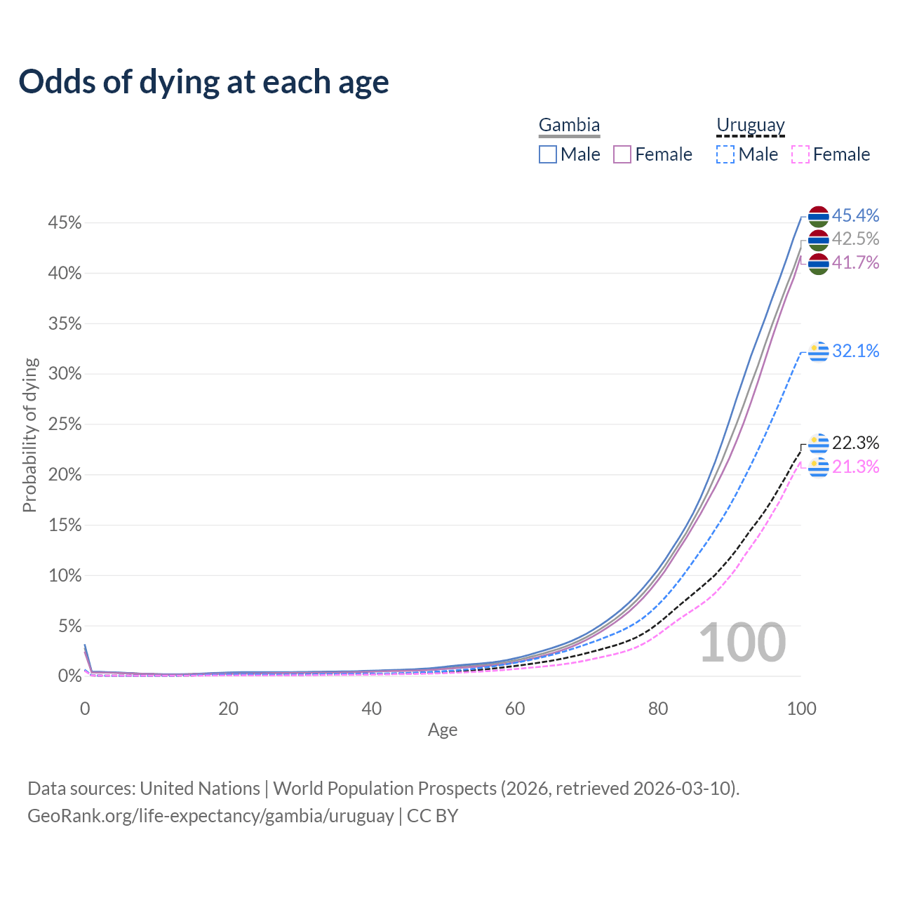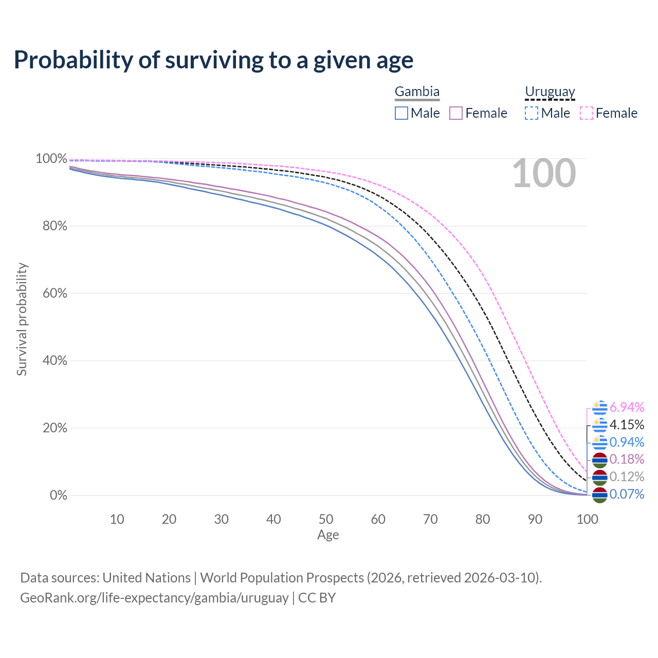 This life expectancy calculator shows the odds of living to 100, 95, 90, and below based on current age for both males and females in the Gambia and Uruguay, along with mean and median age of death. The calculations are based on the 2026 life tables (actuarial tables) from the UN World Population Prospects.