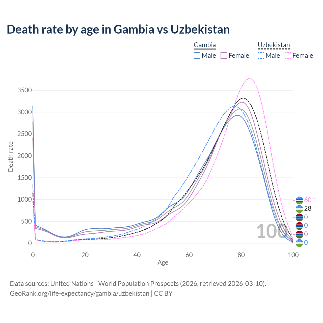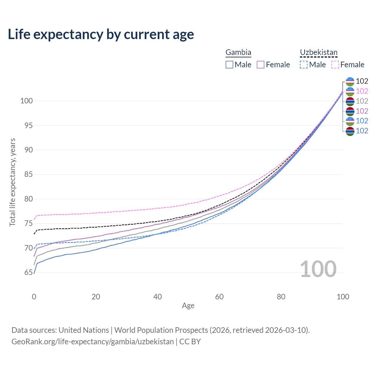 This life expectancy calculator shows the odds of living to 100, 95, 90, and below based on current age for both males and females in the Gambia and Uzbekistan, along with mean and median age of death. The calculations are based on the 2026 life tables (actuarial tables) from the UN World Population Prospects.