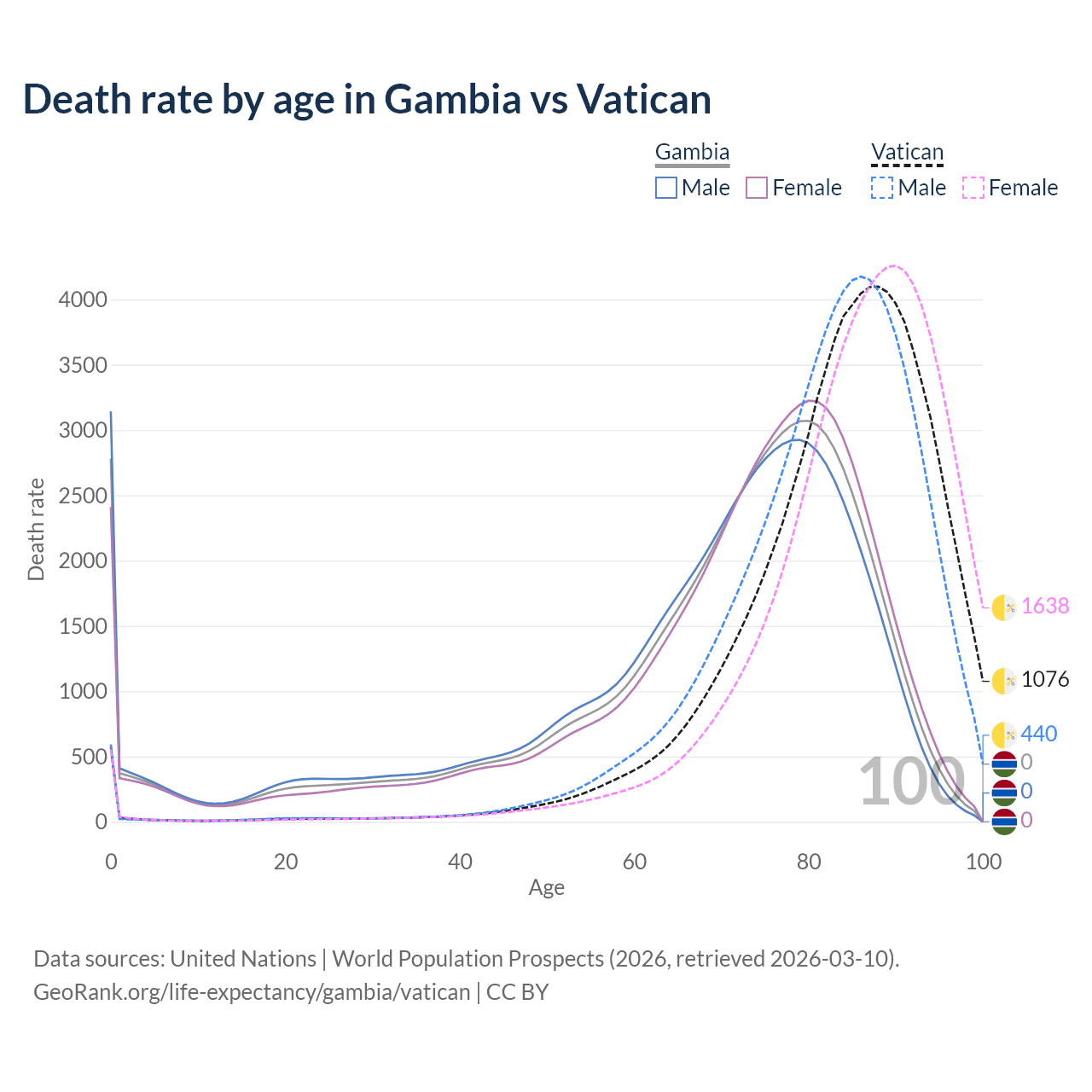 In the Gambia, the most common age of death is 80, compared to 88 in the Vatican. The median age of death is 73.4 in the Gambia and 85.7 in the Vatican, meaning only half of each cohort is expected to live past that age.