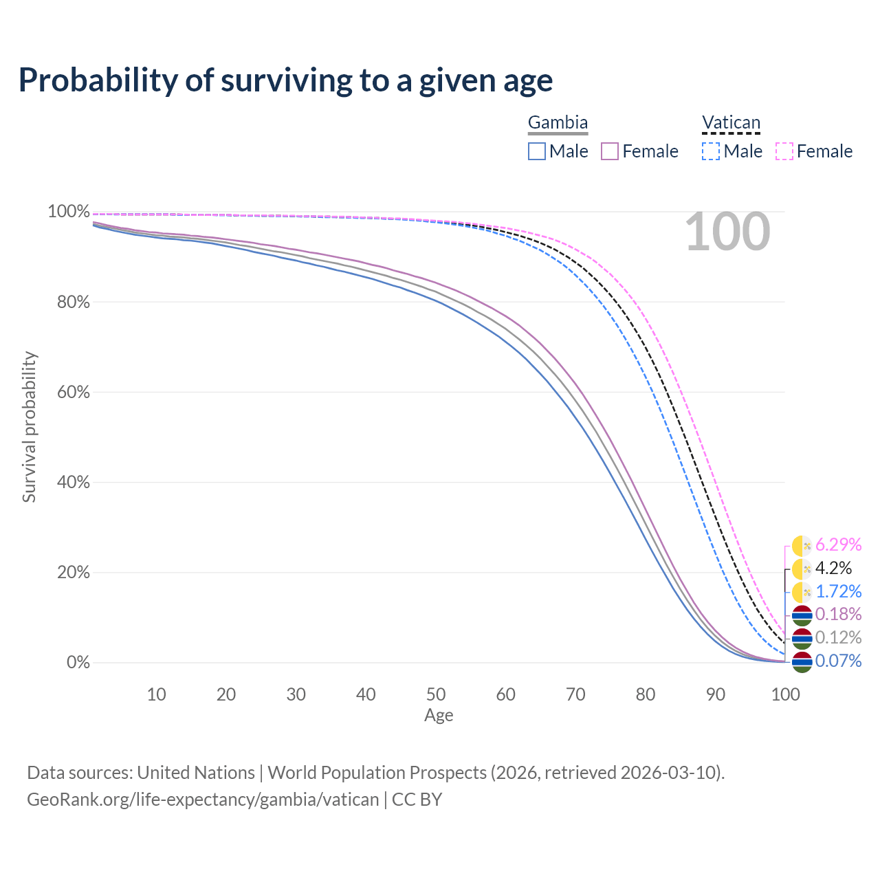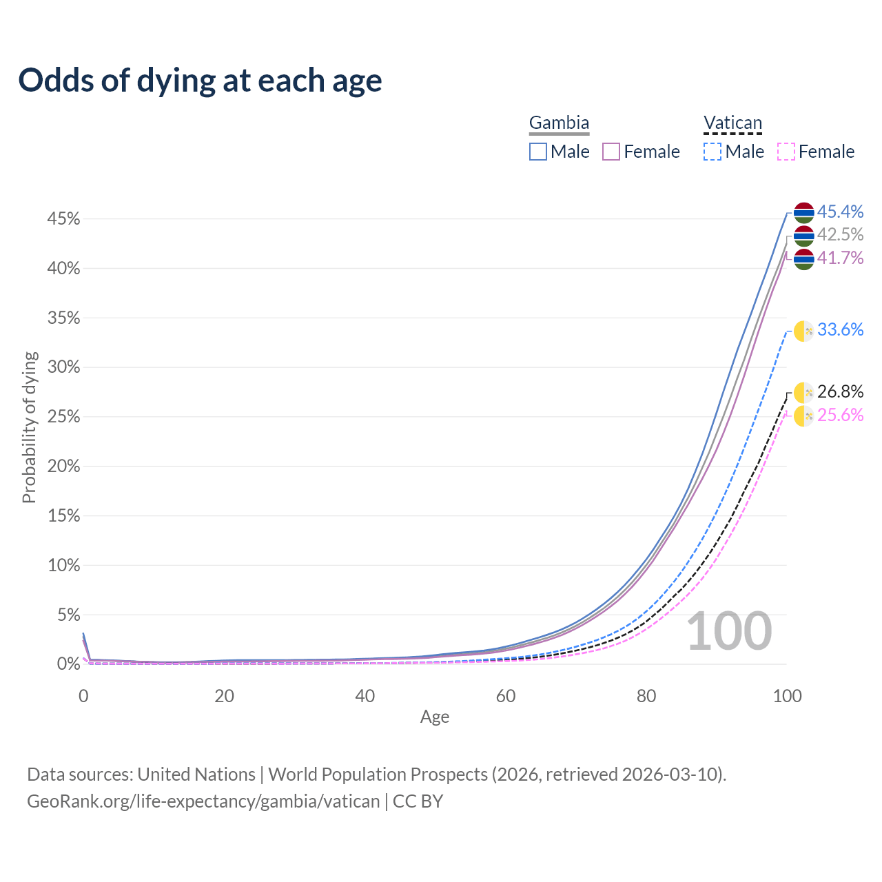 This life expectancy calculator shows the odds of living to 100, 95, 90, and below based on current age for both males and females in the Gambia and the Vatican, along with mean and median age of death. The calculations are based on the 2026 life tables (actuarial tables) from the UN World Population Prospects.