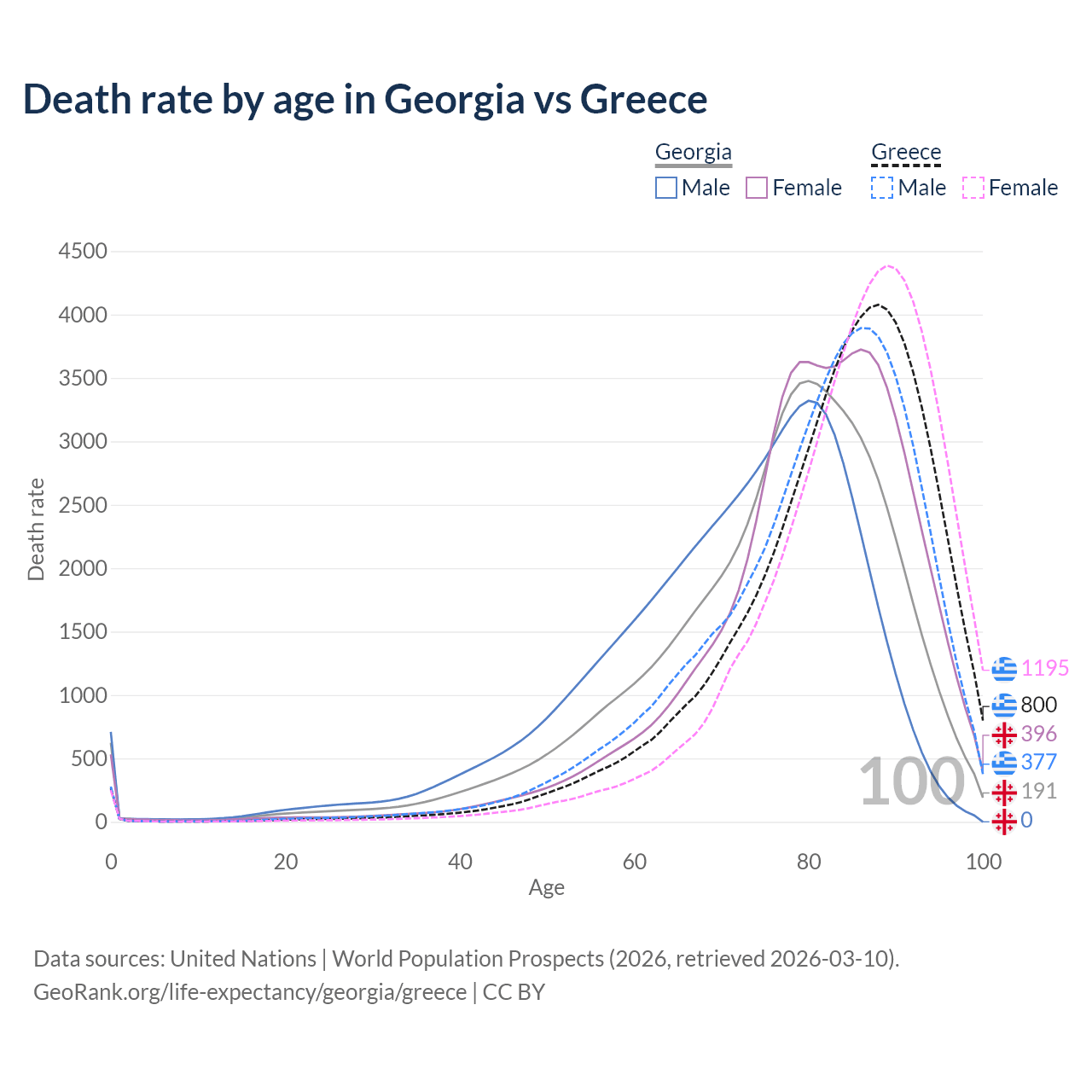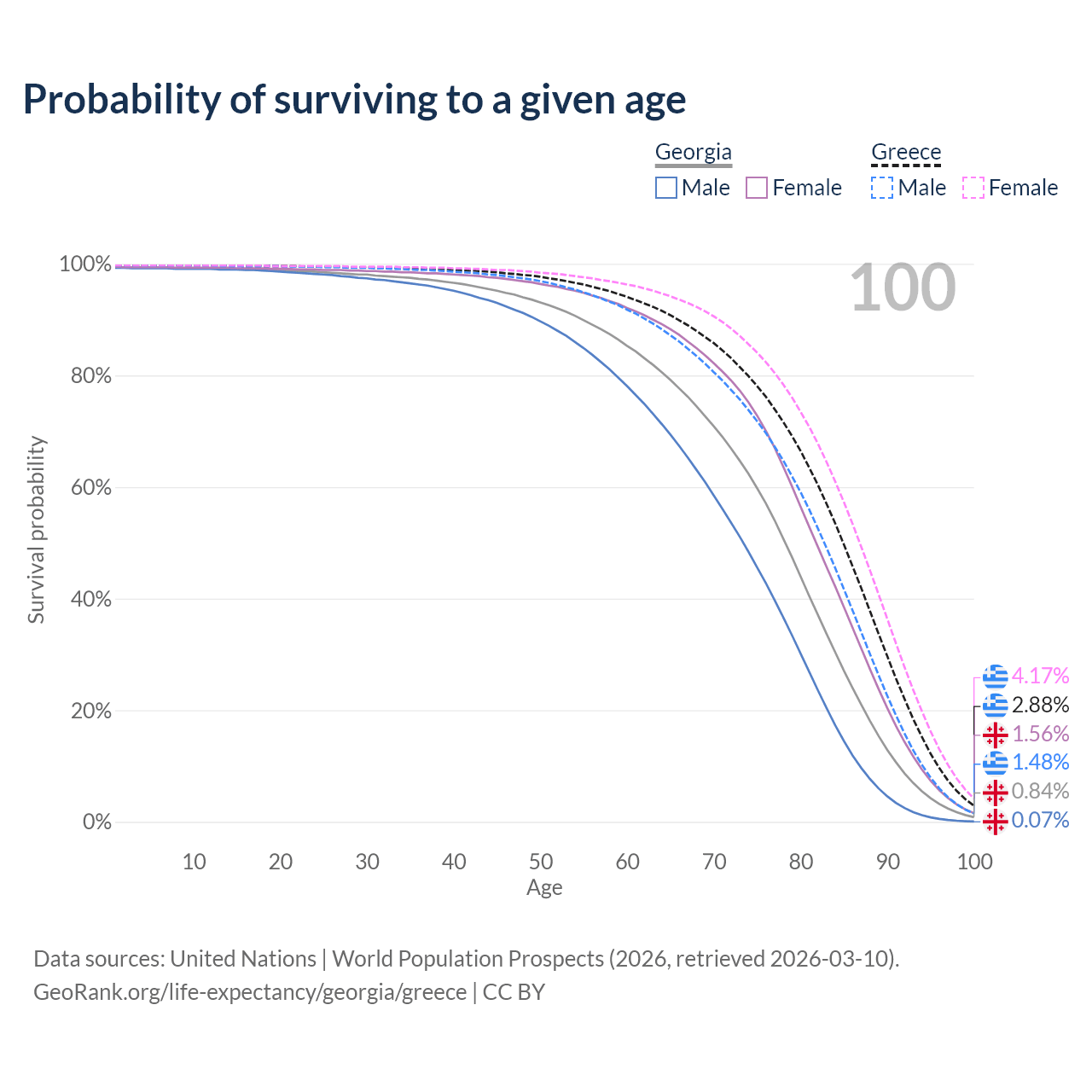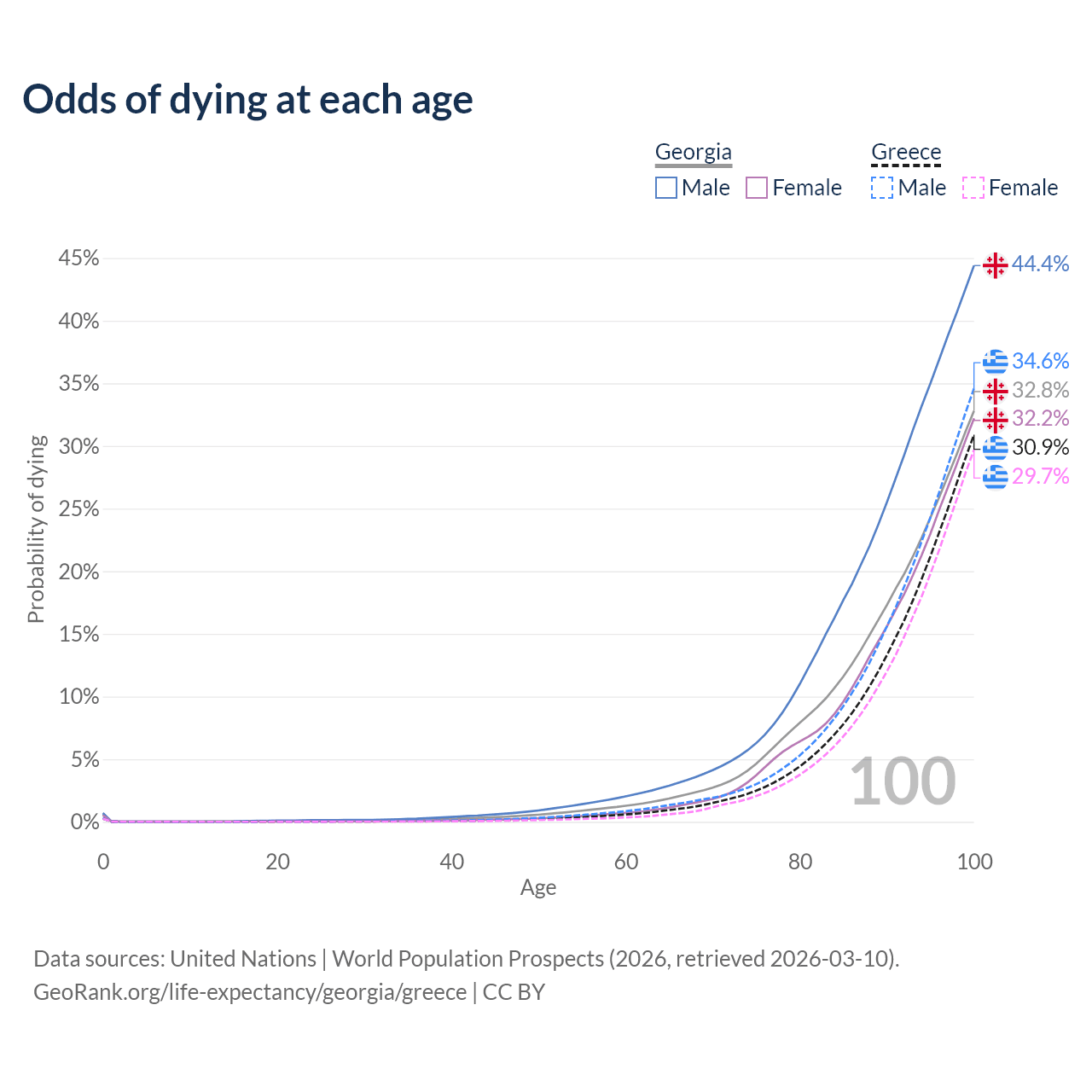 This life expectancy calculator shows the odds of living to 100, 95, 90, and below based on current age for both males and females in Georgia and Greece, along with mean and median age of death. The calculations are based on the 2026 life tables (actuarial tables) from the UN World Population Prospects.