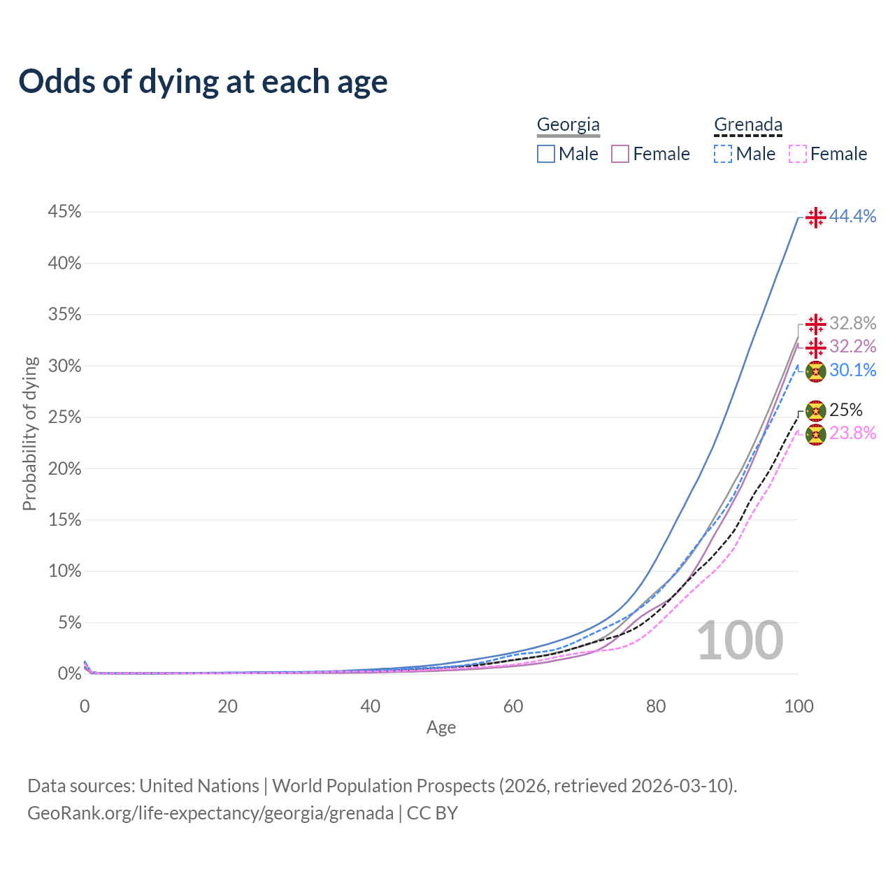 This life expectancy calculator shows the odds of living to 100, 95, 90, and below based on current age for both males and females in Georgia and Grenada, along with mean and median age of death. The calculations are based on the 2026 life tables (actuarial tables) from the UN World Population Prospects.