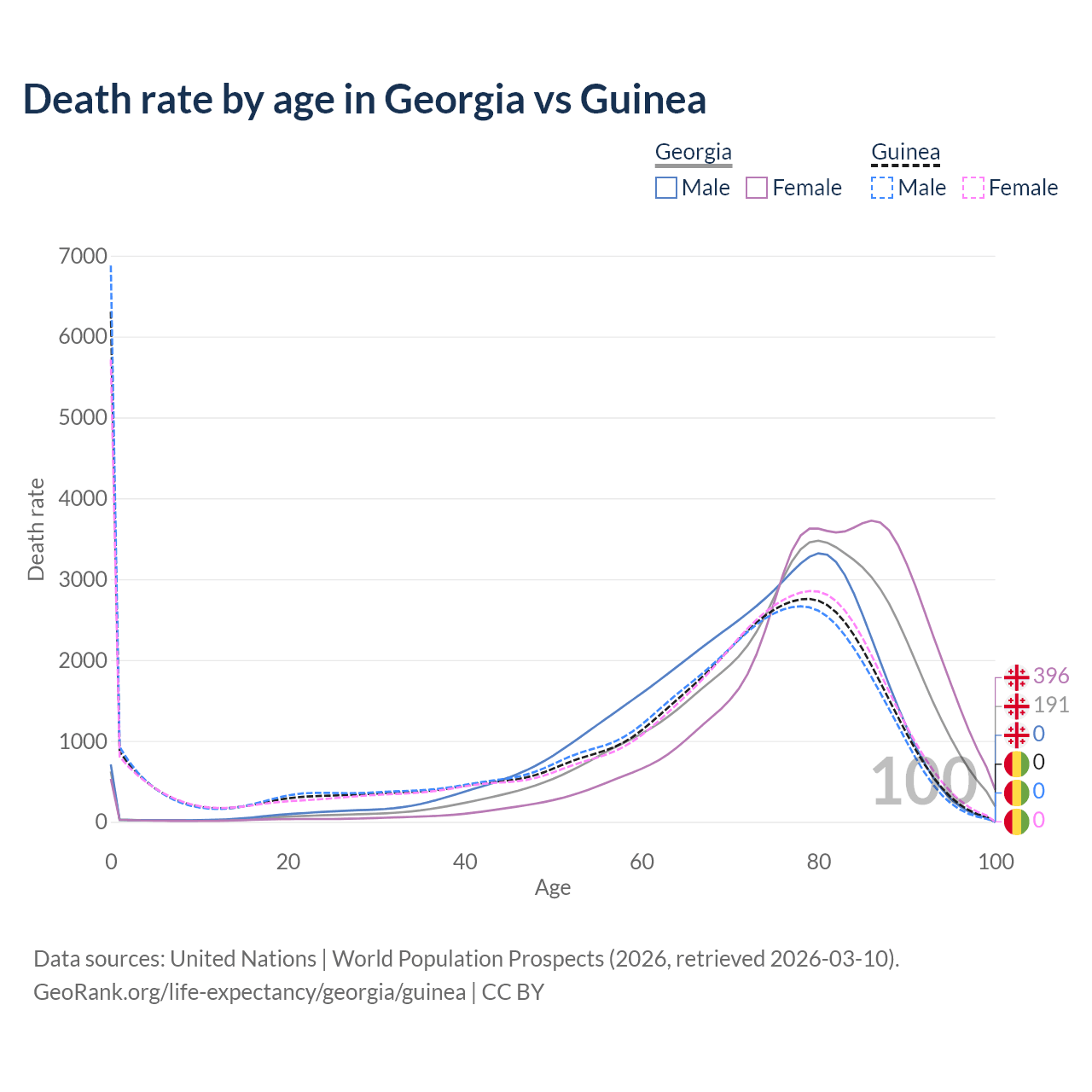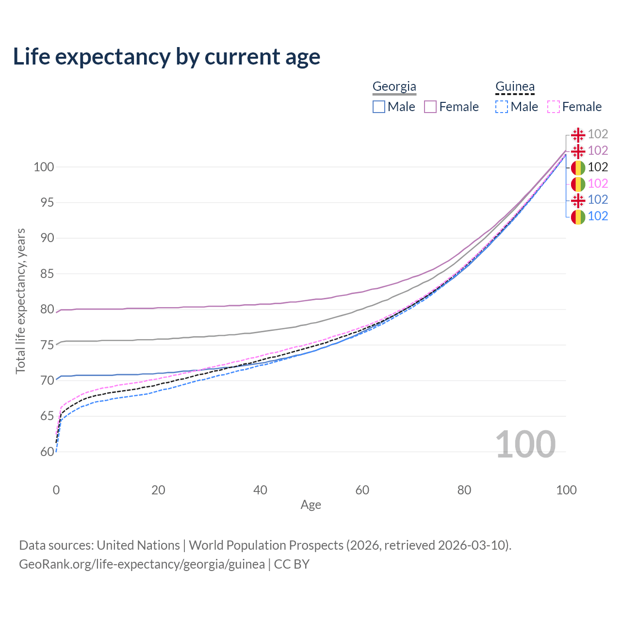 This life expectancy calculator shows the odds of living to 100, 95, 90, and below based on current age for both males and females in Georgia and Guinea, along with mean and median age of death. The calculations are based on the 2026 life tables (actuarial tables) from the UN World Population Prospects.