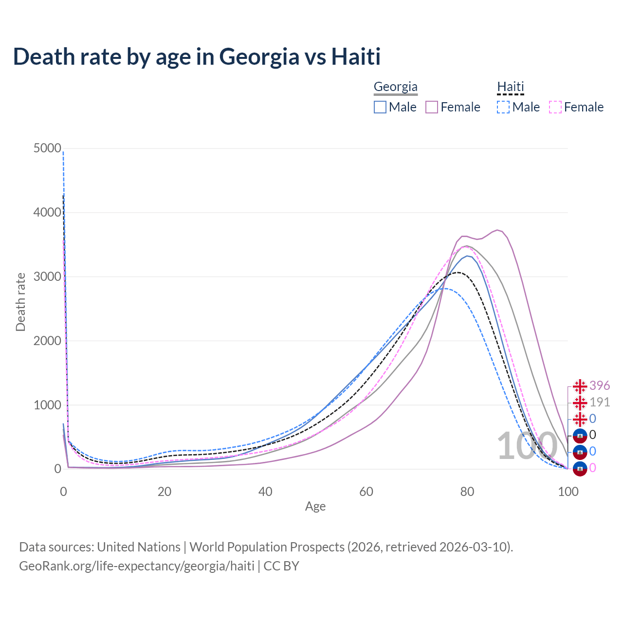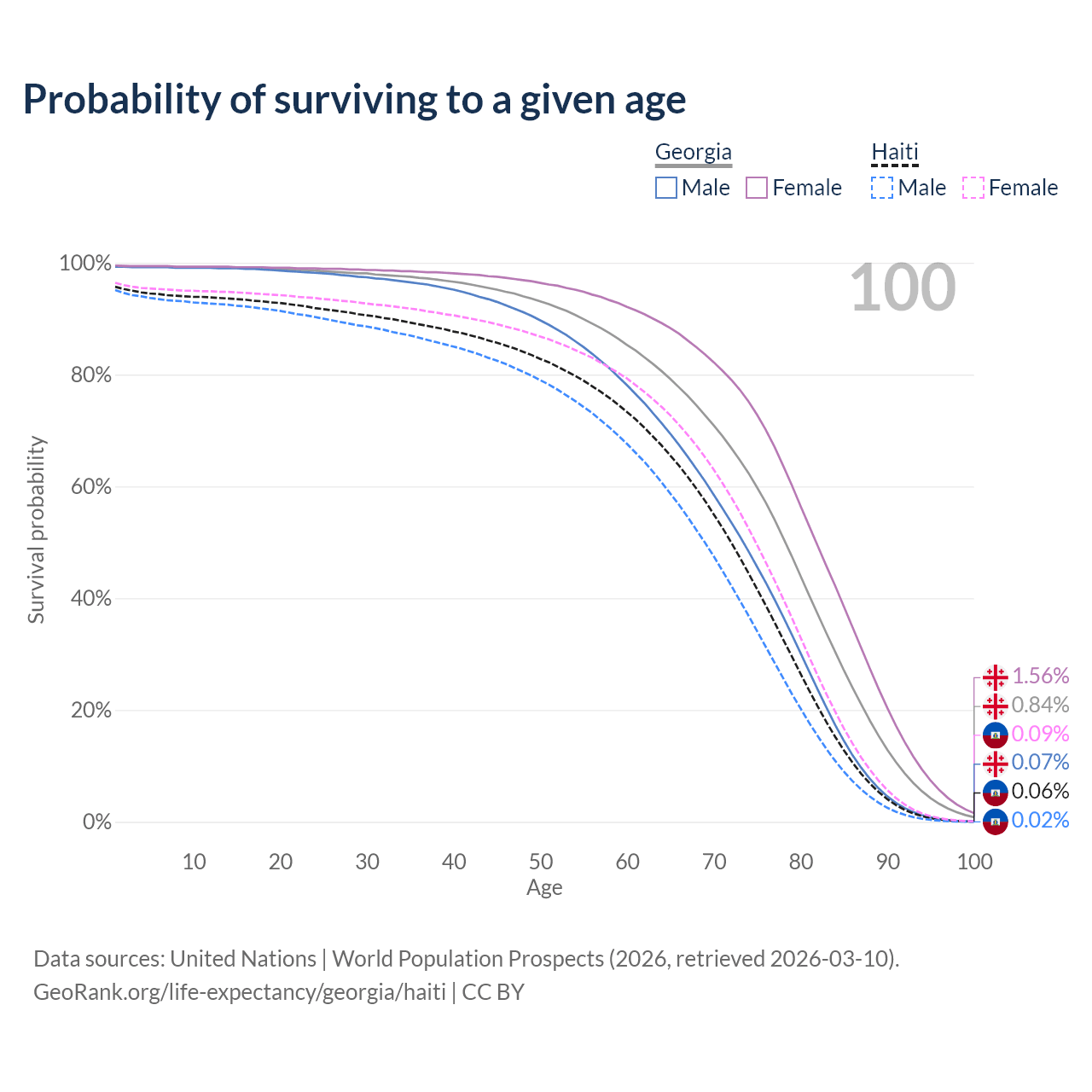 This life expectancy calculator shows the odds of living to 100, 95, 90, and below based on current age for both males and females in Georgia and Haiti, along with mean and median age of death. The calculations are based on the 2026 life tables (actuarial tables) from the UN World Population Prospects.