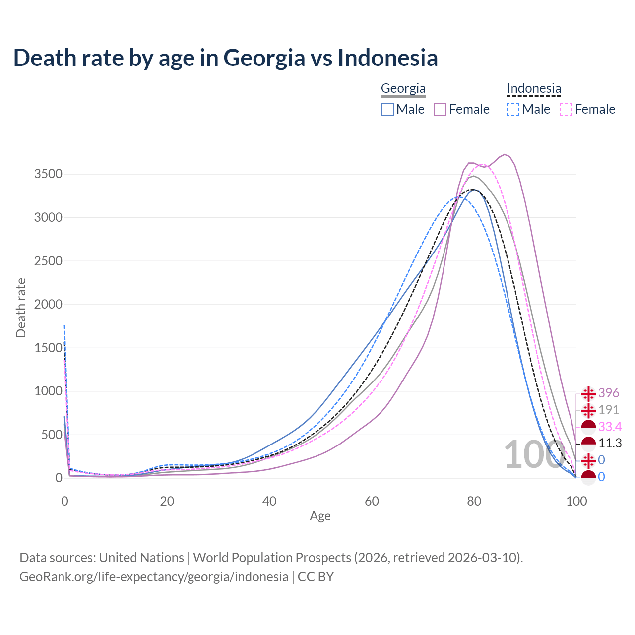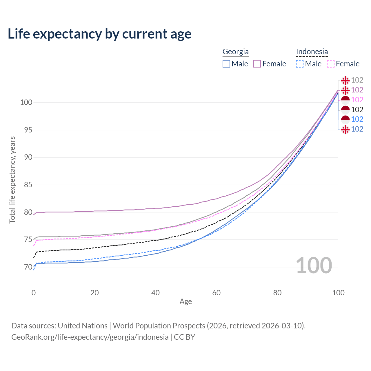 This life expectancy calculator shows the odds of living to 100, 95, 90, and below based on current age for both males and females in Georgia and Indonesia, along with mean and median age of death. The calculations are based on the 2026 life tables (actuarial tables) from the UN World Population Prospects.