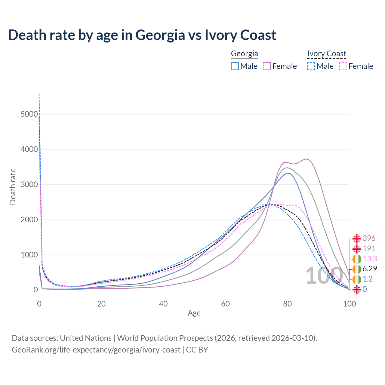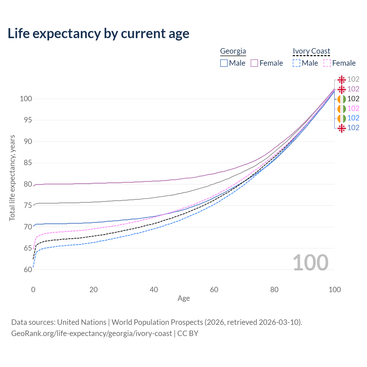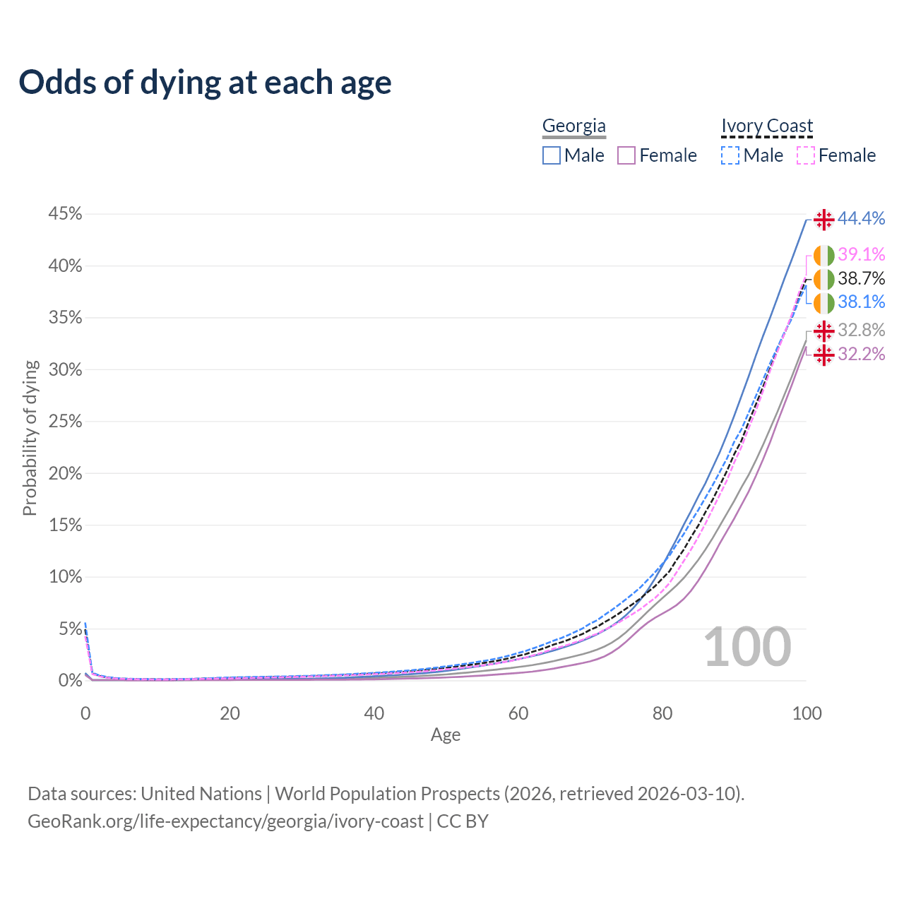 This life expectancy calculator shows the odds of living to 100, 95, 90, and below based on current age for both males and females in Georgia and Ivory Coast, along with mean and median age of death. The calculations are based on the 2026 life tables (actuarial tables) from the UN World Population Prospects.