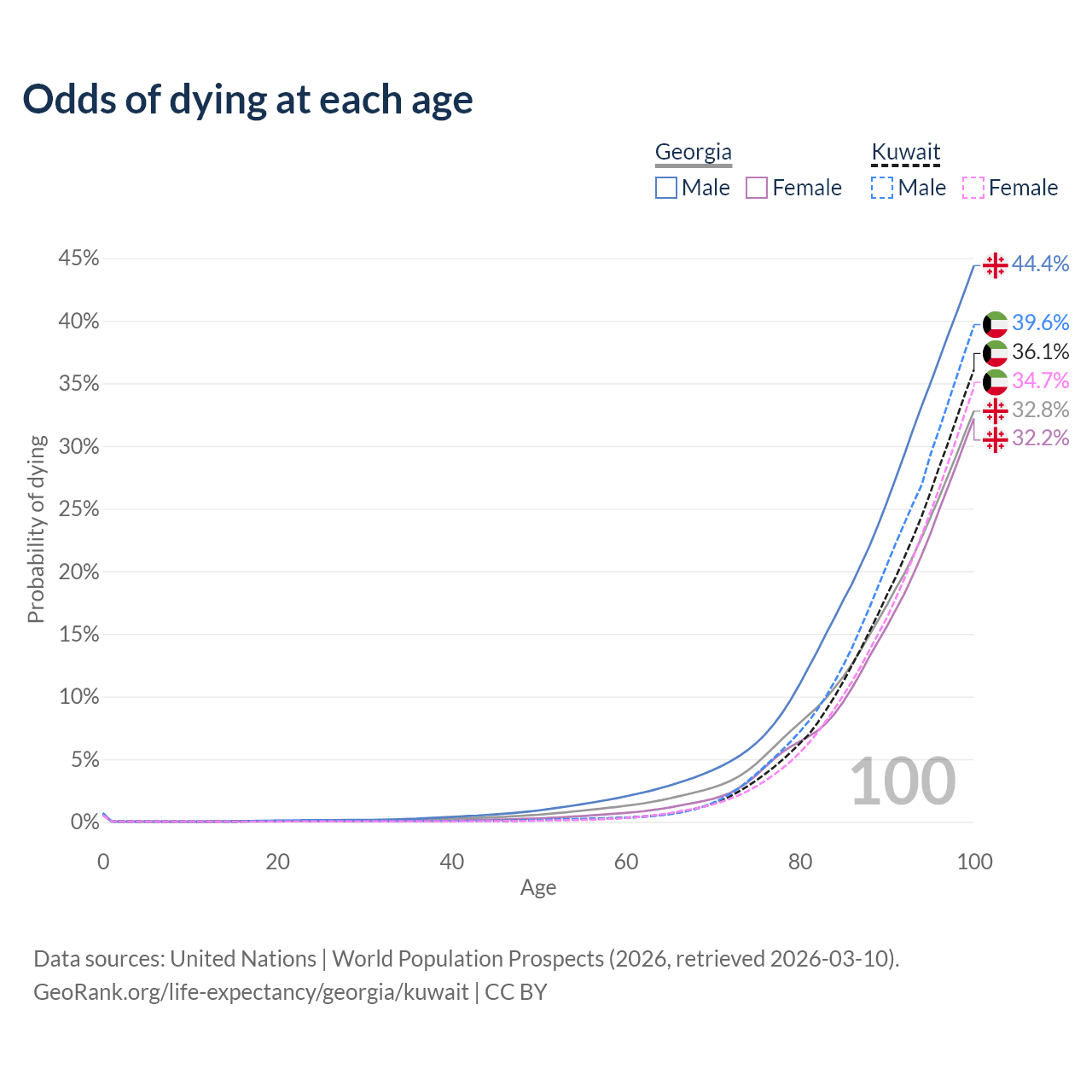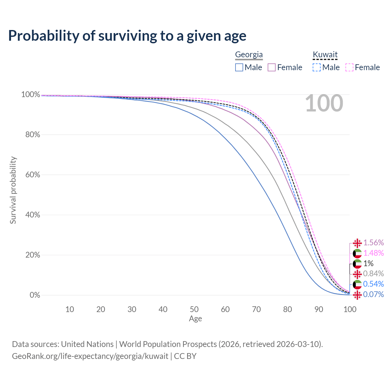 This life expectancy calculator shows the odds of living to 100, 95, 90, and below based on current age for both males and females in Georgia and Kuwait, along with mean and median age of death. The calculations are based on the 2026 life tables (actuarial tables) from the UN World Population Prospects.