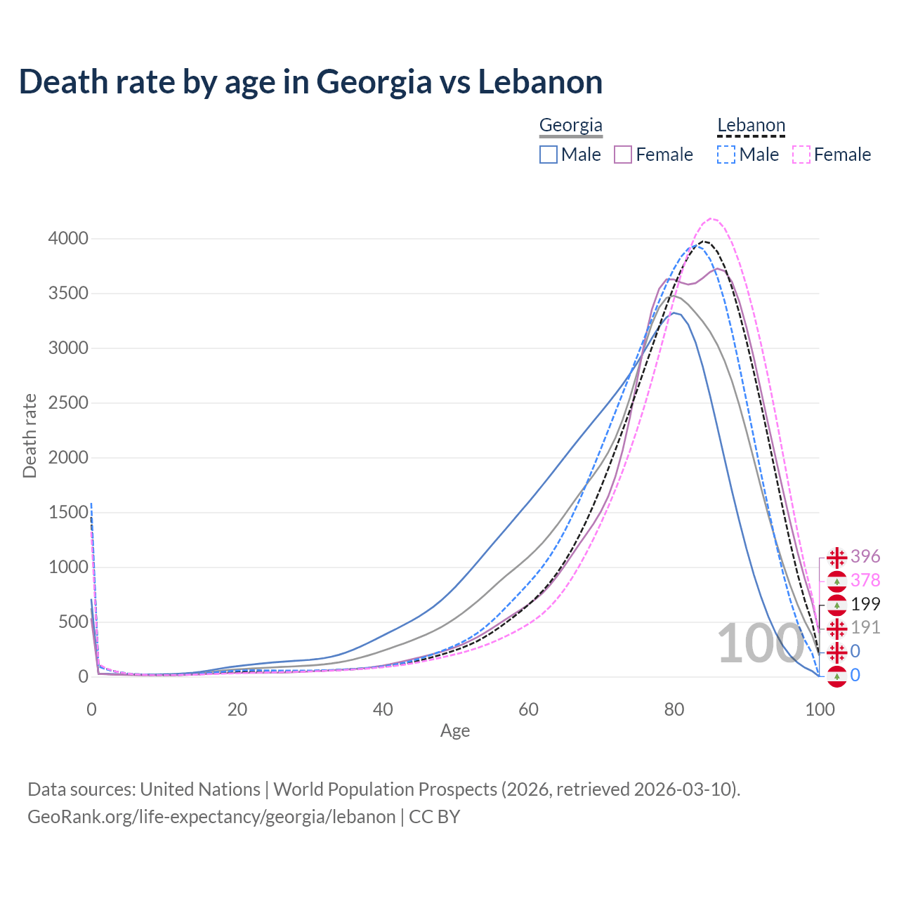 In Georgia, the most common age of death is 80, compared to 84 in Lebanon. The median age of death is 78.2 in Georgia and 81.6 in Lebanon, meaning only half of each cohort is expected to live past that age.