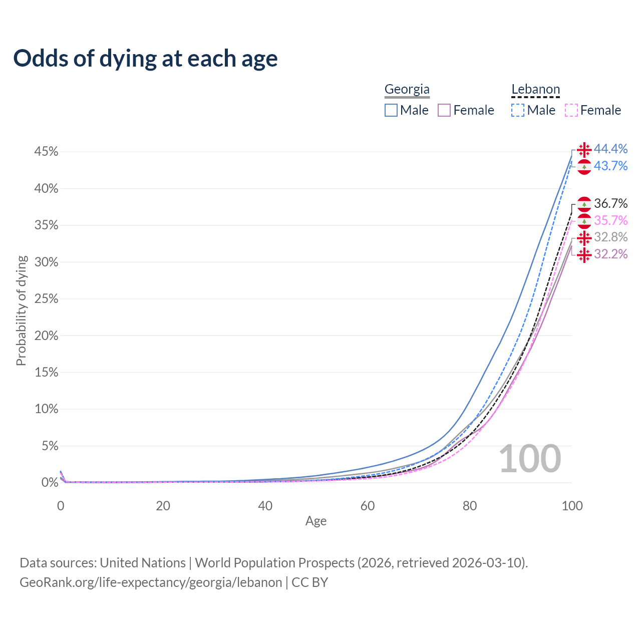This life expectancy calculator shows the odds of living to 100, 95, 90, and below based on current age for both males and females in Georgia and Lebanon, along with mean and median age of death. The calculations are based on the 2026 life tables (actuarial tables) from the UN World Population Prospects.