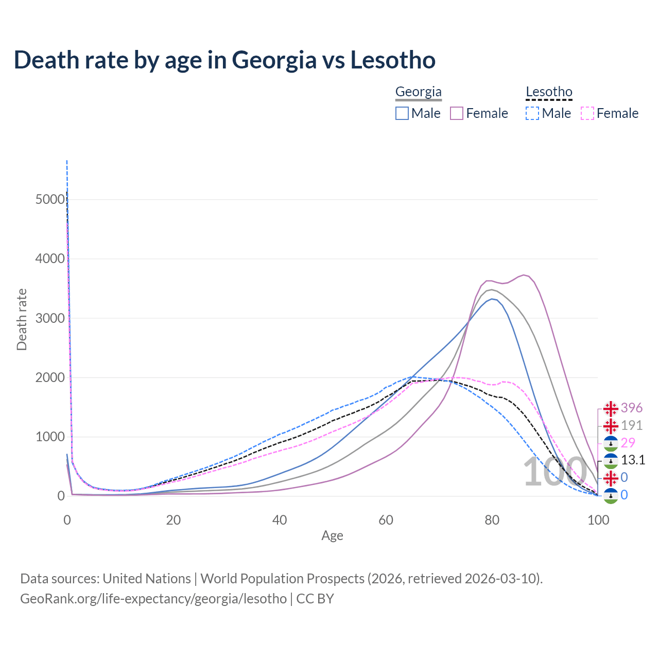 In Georgia, the most common age of death is 80, compared to 0 in Lesotho. The median age of death is 78.2 in Georgia and 63.4 in Lesotho, meaning only half of each cohort is expected to live past that age.