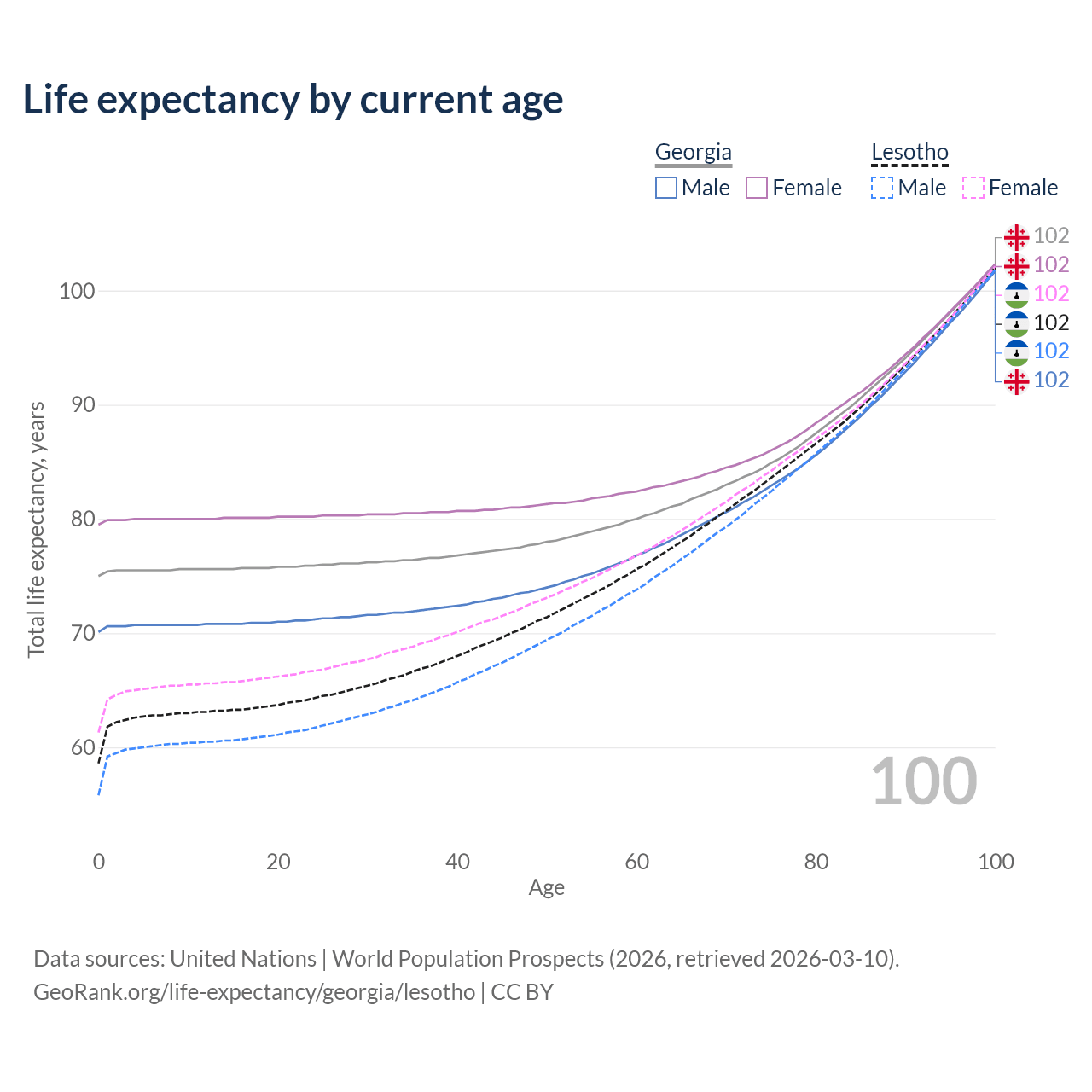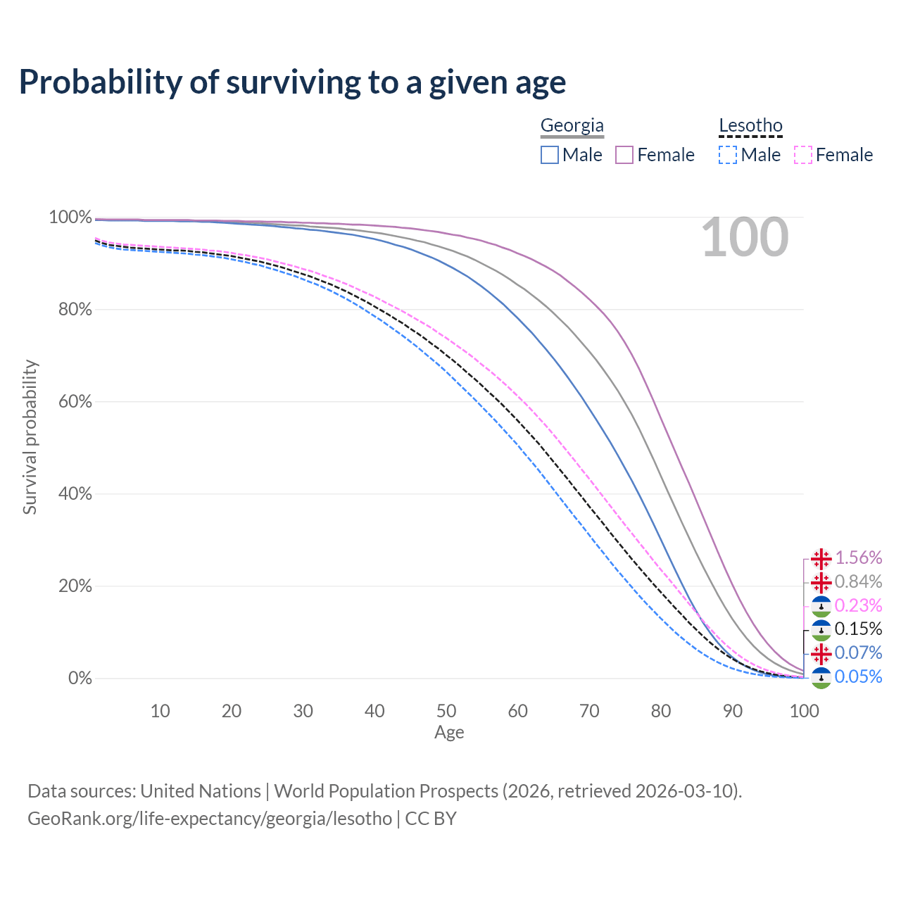 This life expectancy calculator shows the odds of living to 100, 95, 90, and below based on current age for both males and females in Georgia and Lesotho, along with mean and median age of death. The calculations are based on the 2026 life tables (actuarial tables) from the UN World Population Prospects.