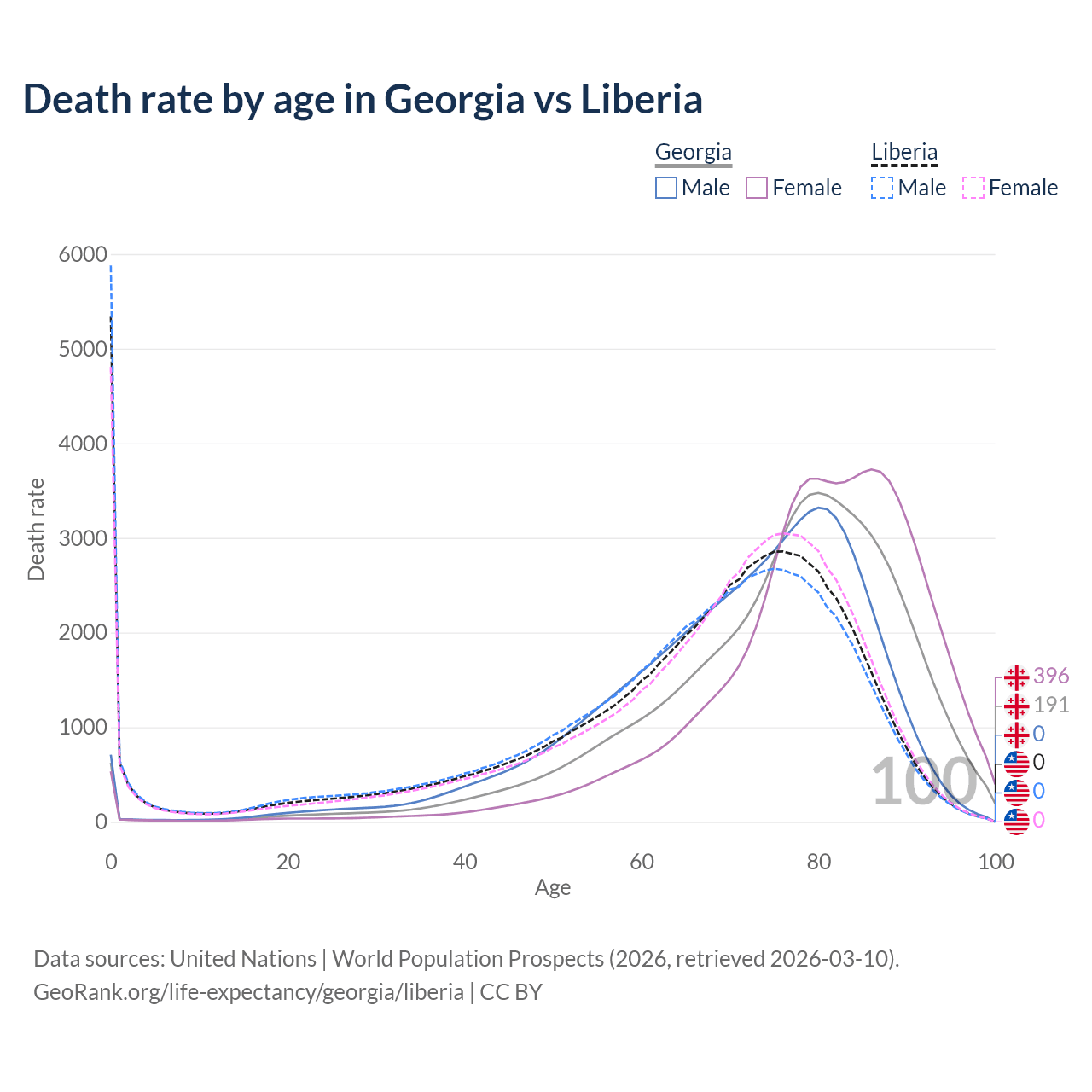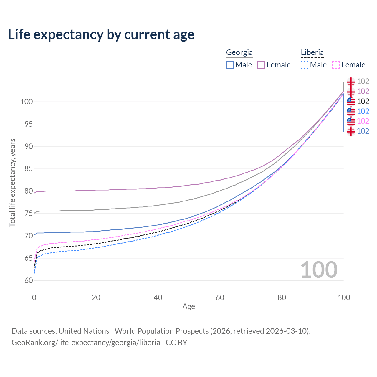 This life expectancy calculator shows the odds of living to 100, 95, 90, and below based on current age for both males and females in Georgia and Liberia, along with mean and median age of death. The calculations are based on the 2026 life tables (actuarial tables) from the UN World Population Prospects.