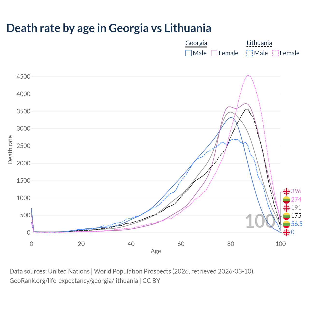 In Georgia, the most common age of death is 80, compared to 86 in Lithuania. The median age of death is 78.2 in Georgia and 80.4 in Lithuania, meaning only half of each cohort is expected to live past that age.