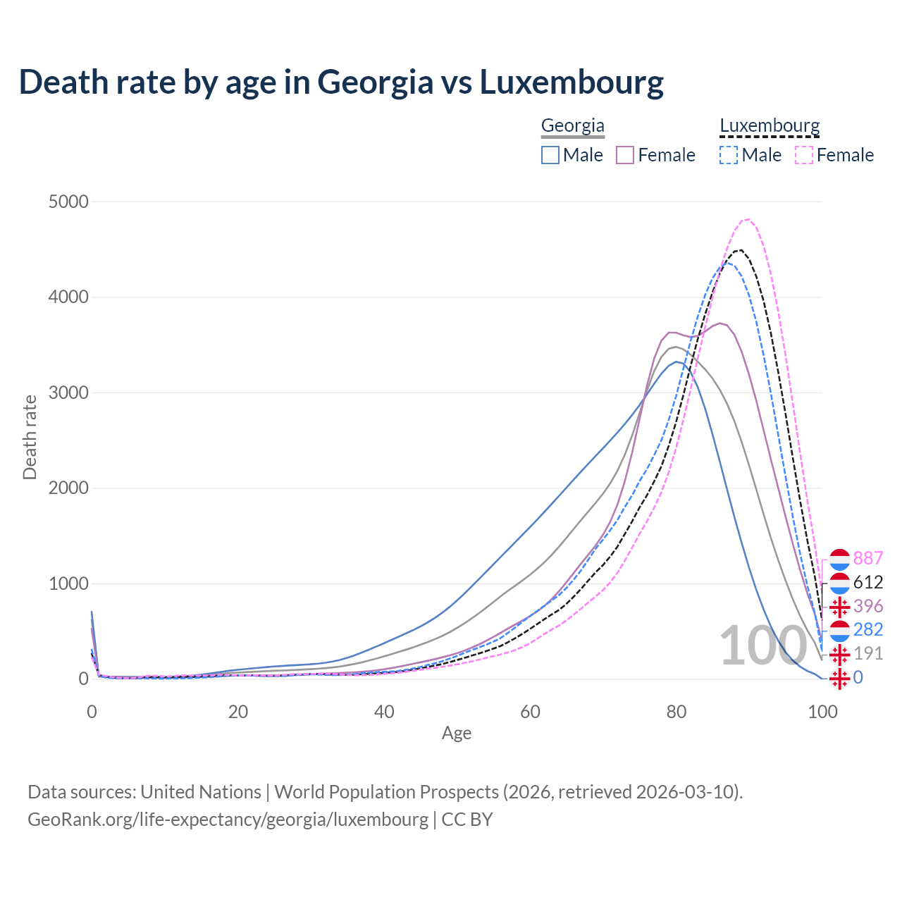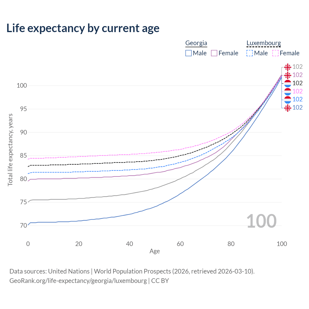 This life expectancy calculator shows the odds of living to 100, 95, 90, and below based on current age for both males and females in Georgia and Luxembourg, along with mean and median age of death. The calculations are based on the 2026 life tables (actuarial tables) from the UN World Population Prospects.