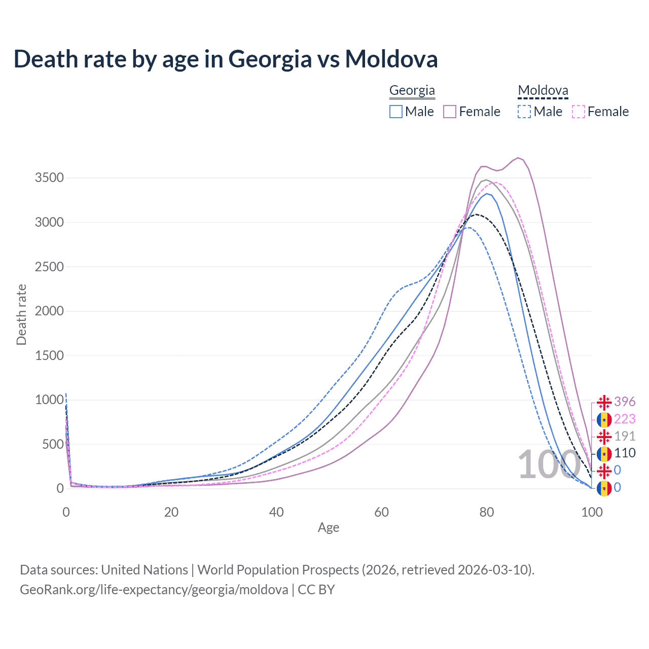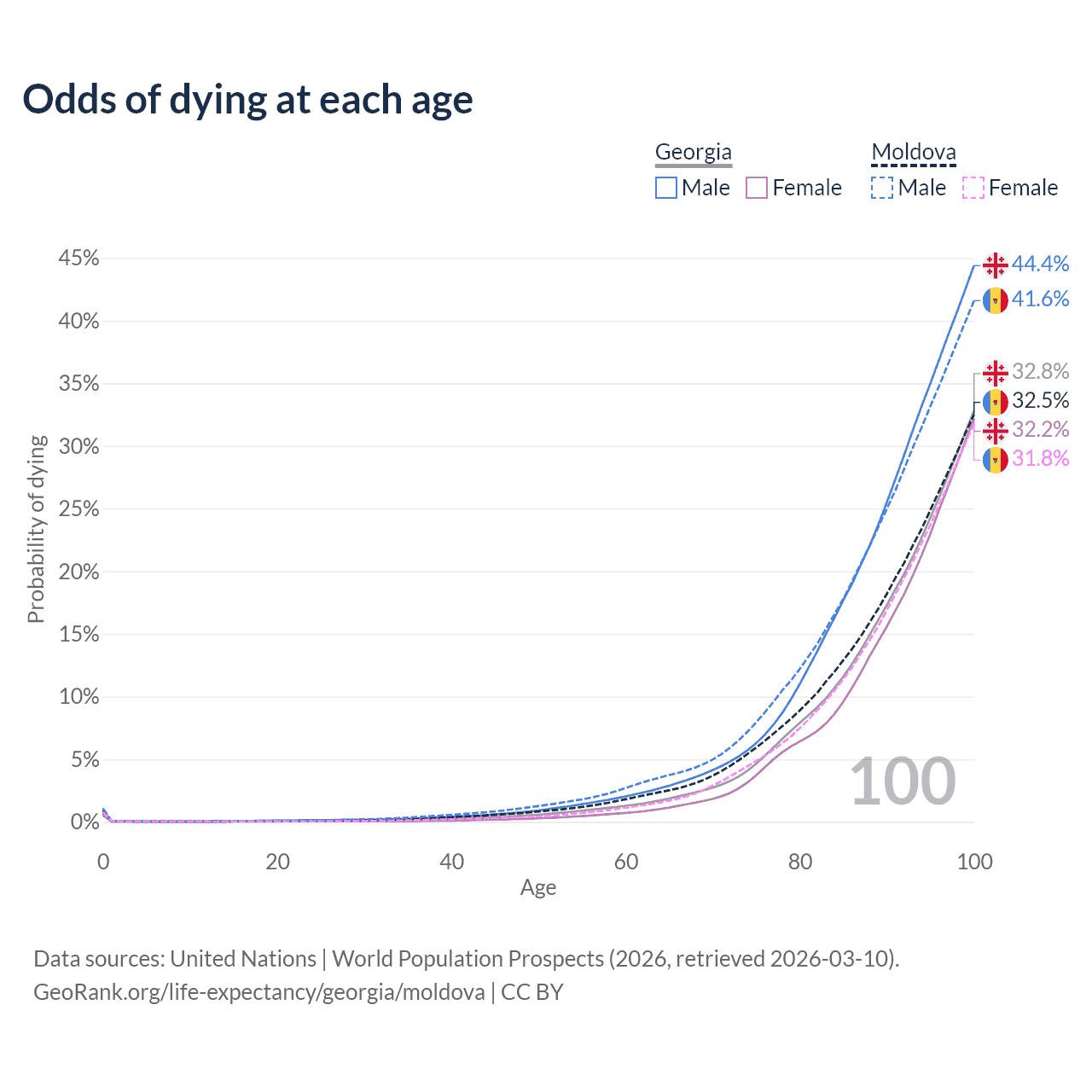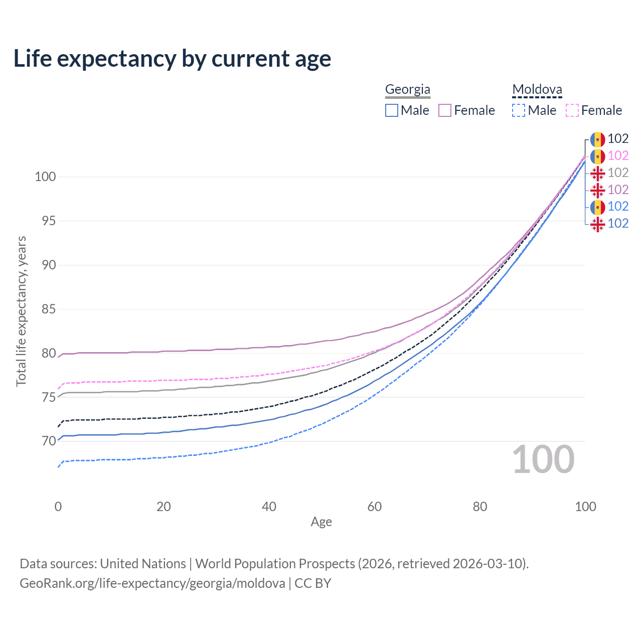 This life expectancy calculator shows the odds of living to 100, 95, 90, and below based on current age for both males and females in Georgia and Moldova, along with mean and median age of death. The calculations are based on the 2026 life tables (actuarial tables) from the UN World Population Prospects.
