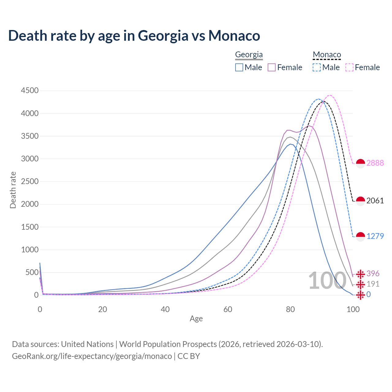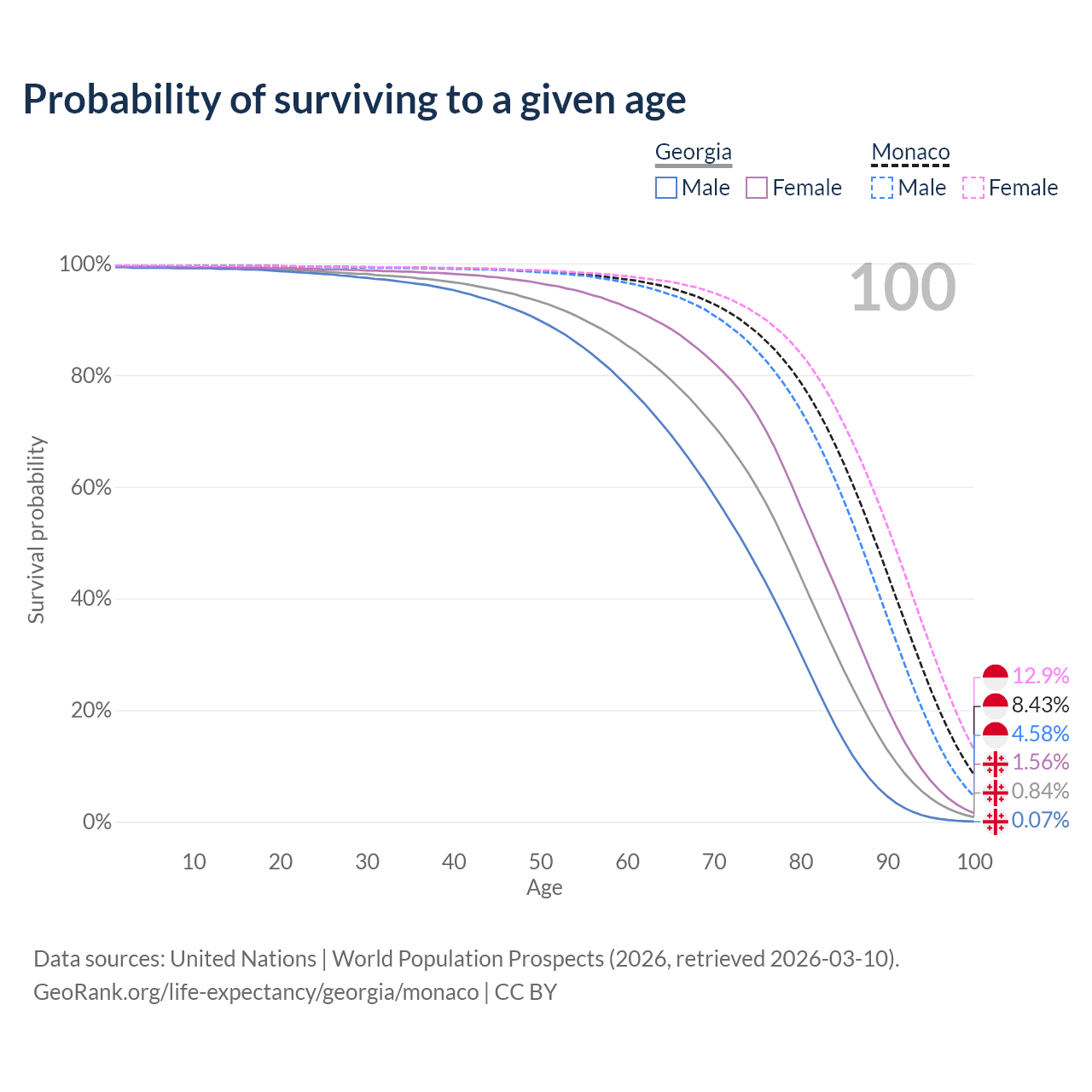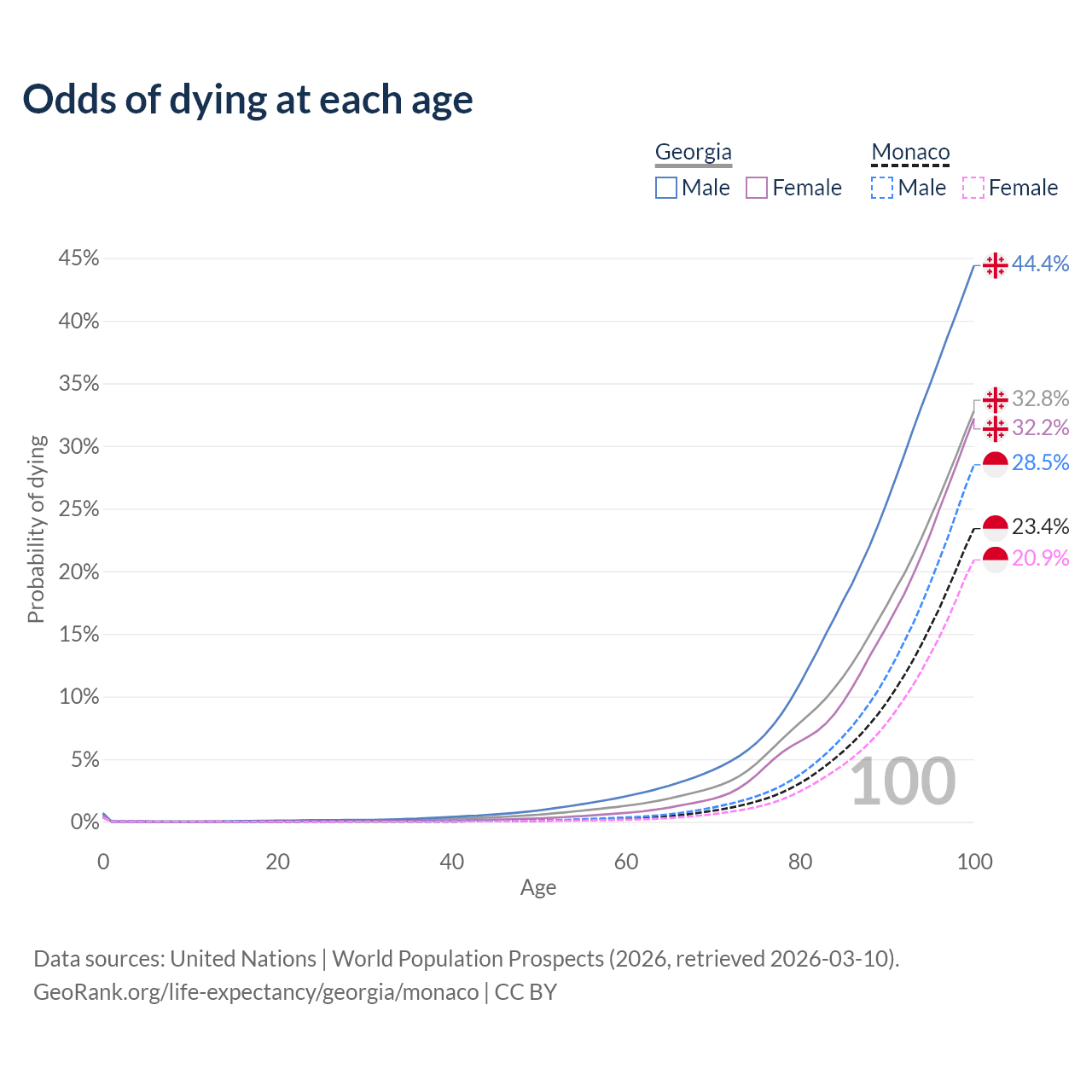 This life expectancy calculator shows the odds of living to 100, 95, 90, and below based on current age for both males and females in Georgia and Monaco, along with mean and median age of death. The calculations are based on the 2026 life tables (actuarial tables) from the UN World Population Prospects.