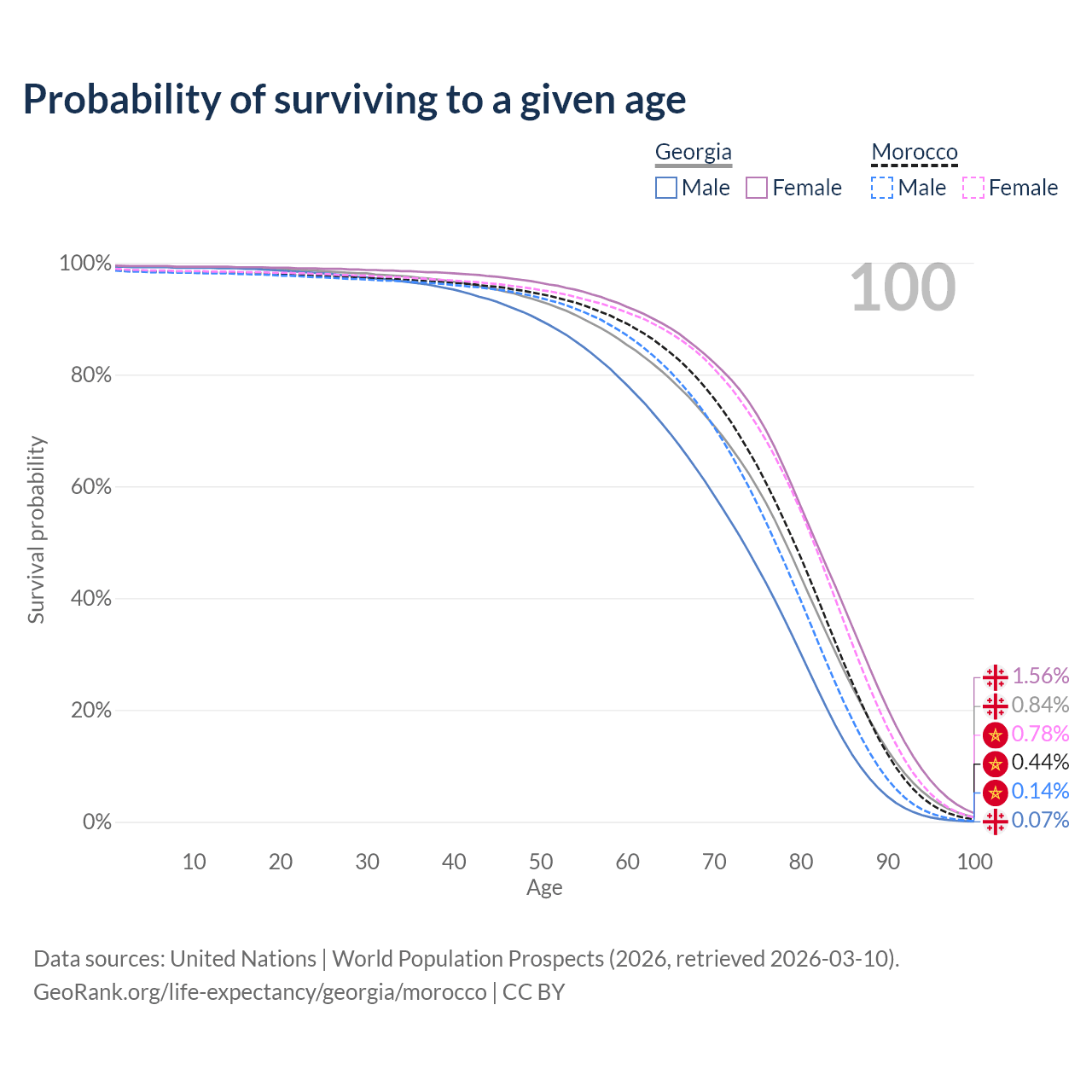 This life expectancy calculator shows the odds of living to 100, 95, 90, and below based on current age for both males and females in Georgia and Morocco, along with mean and median age of death. The calculations are based on the 2026 life tables (actuarial tables) from the UN World Population Prospects.