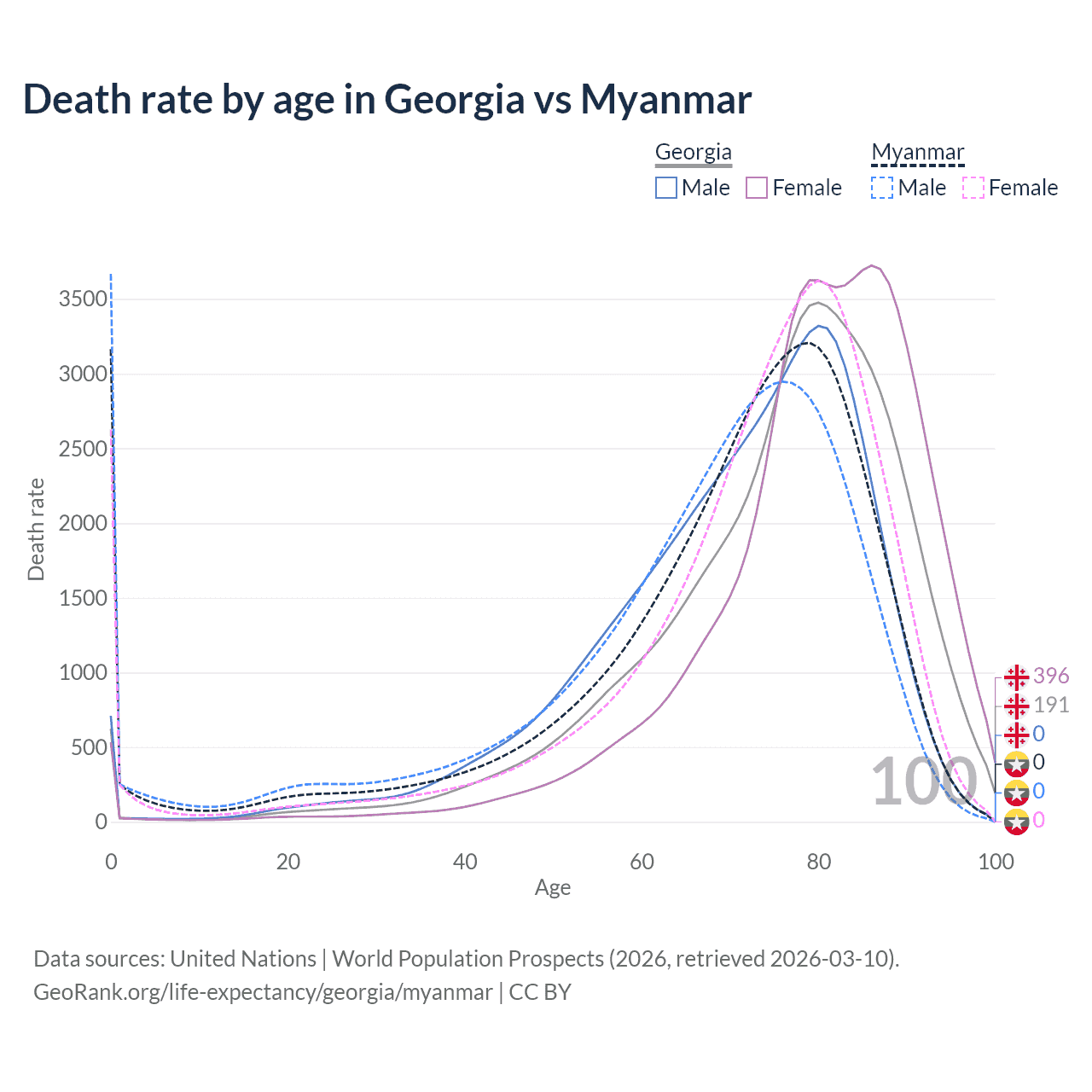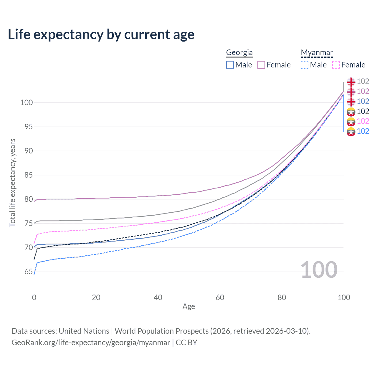 This life expectancy calculator shows the odds of living to 100, 95, 90, and below based on current age for both males and females in Georgia and Myanmar, along with mean and median age of death. The calculations are based on the 2026 life tables (actuarial tables) from the UN World Population Prospects.