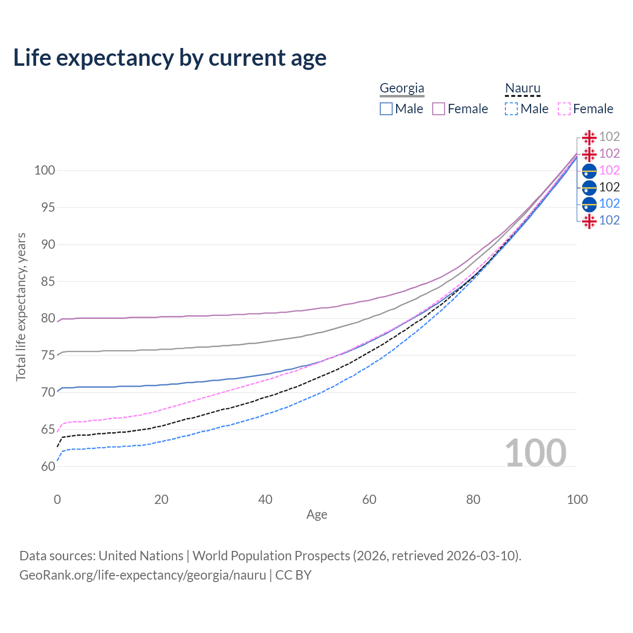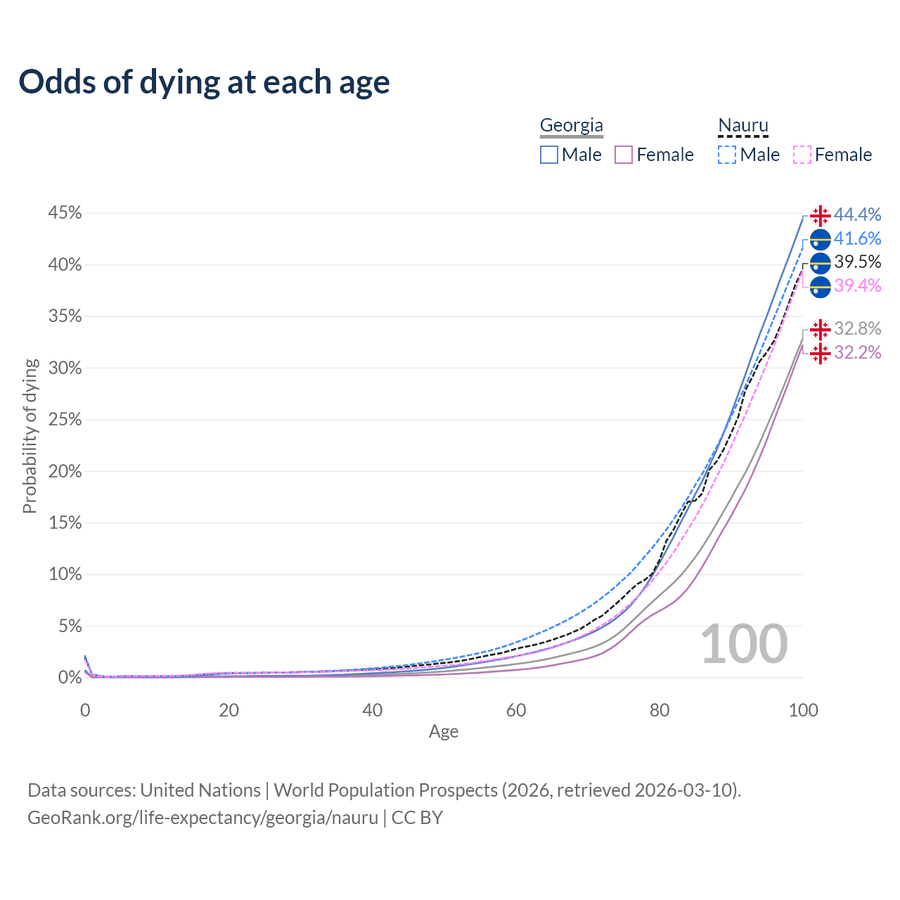 This life expectancy calculator shows the odds of living to 100, 95, 90, and below based on current age for both males and females in Georgia and Nauru, along with mean and median age of death. The calculations are based on the 2026 life tables (actuarial tables) from the UN World Population Prospects.