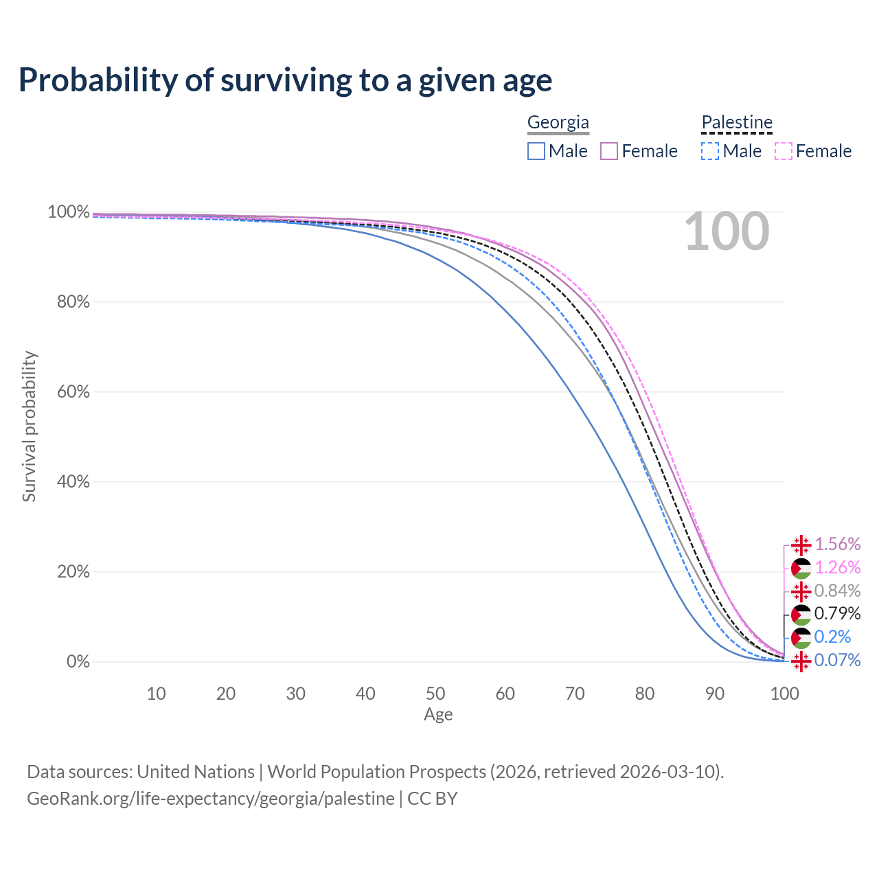 This life expectancy calculator shows the odds of living to 100, 95, 90, and below based on current age for both males and females in Georgia and Palestine, along with mean and median age of death. The calculations are based on the 2026 life tables (actuarial tables) from the UN World Population Prospects.
