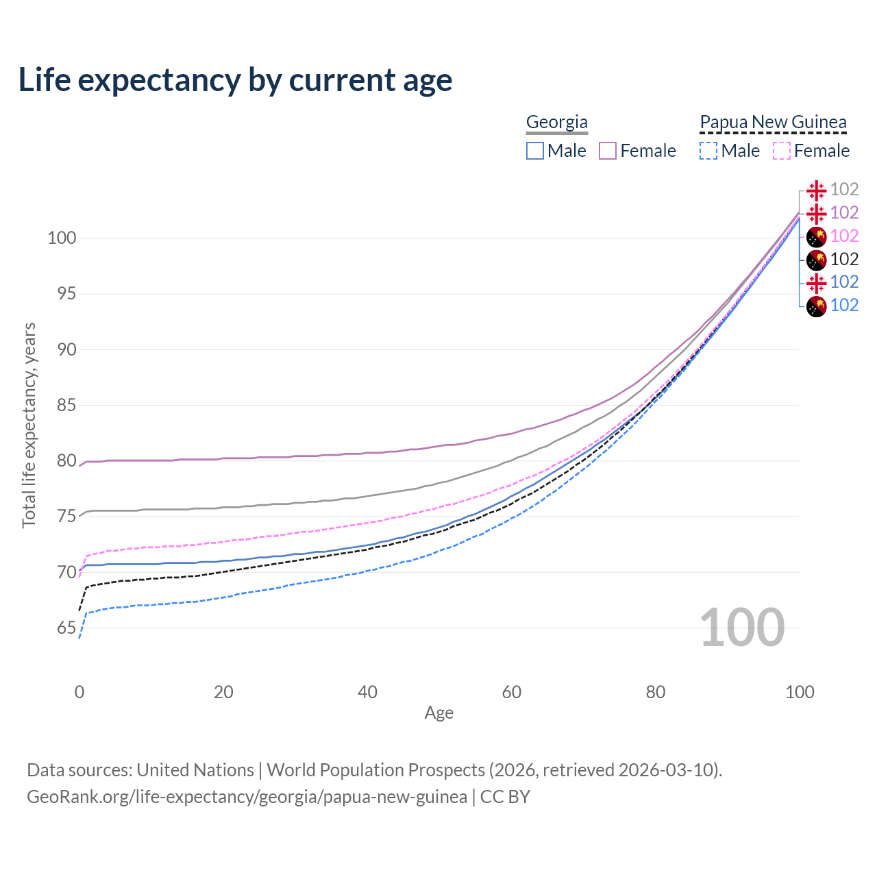This life expectancy calculator shows the odds of living to 100, 95, 90, and below based on current age for both males and females in Georgia and Papua New Guinea, along with mean and median age of death. The calculations are based on the 2026 life tables (actuarial tables) from the UN World Population Prospects.