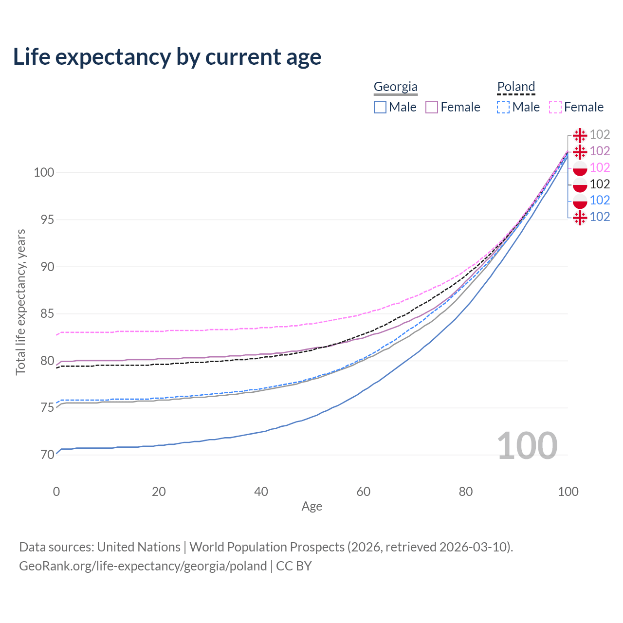 This life expectancy calculator shows the odds of living to 100, 95, 90, and below based on current age for both males and females in Georgia and Poland, along with mean and median age of death. The calculations are based on the 2026 life tables (actuarial tables) from the UN World Population Prospects.