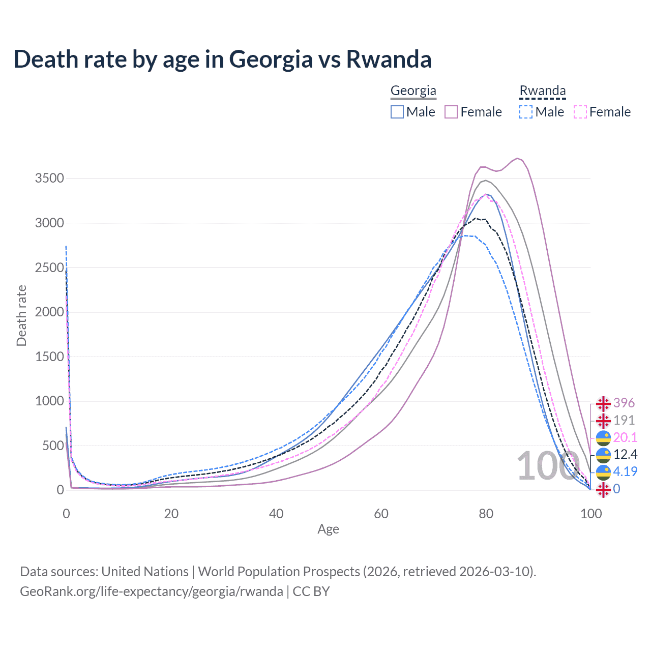 In Georgia, the most common age of death is 80, compared to 78 in Rwanda. The median age of death is 78.2 in Georgia and 73.5 in Rwanda, meaning only half of each cohort is expected to live past that age.