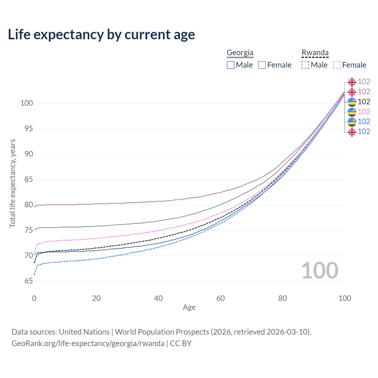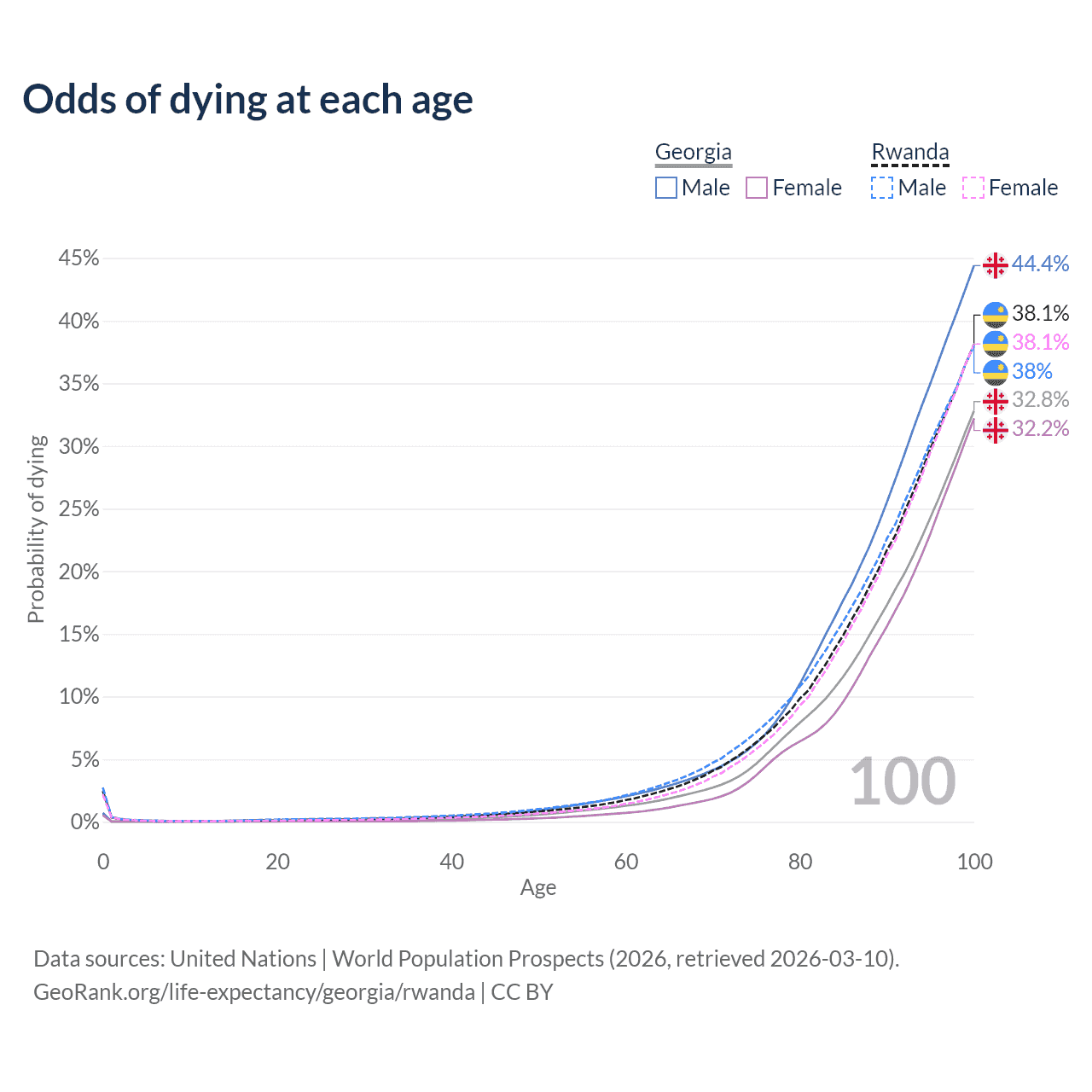 This life expectancy calculator shows the odds of living to 100, 95, 90, and below based on current age for both males and females in Georgia and Rwanda, along with mean and median age of death. The calculations are based on the 2026 life tables (actuarial tables) from the UN World Population Prospects.