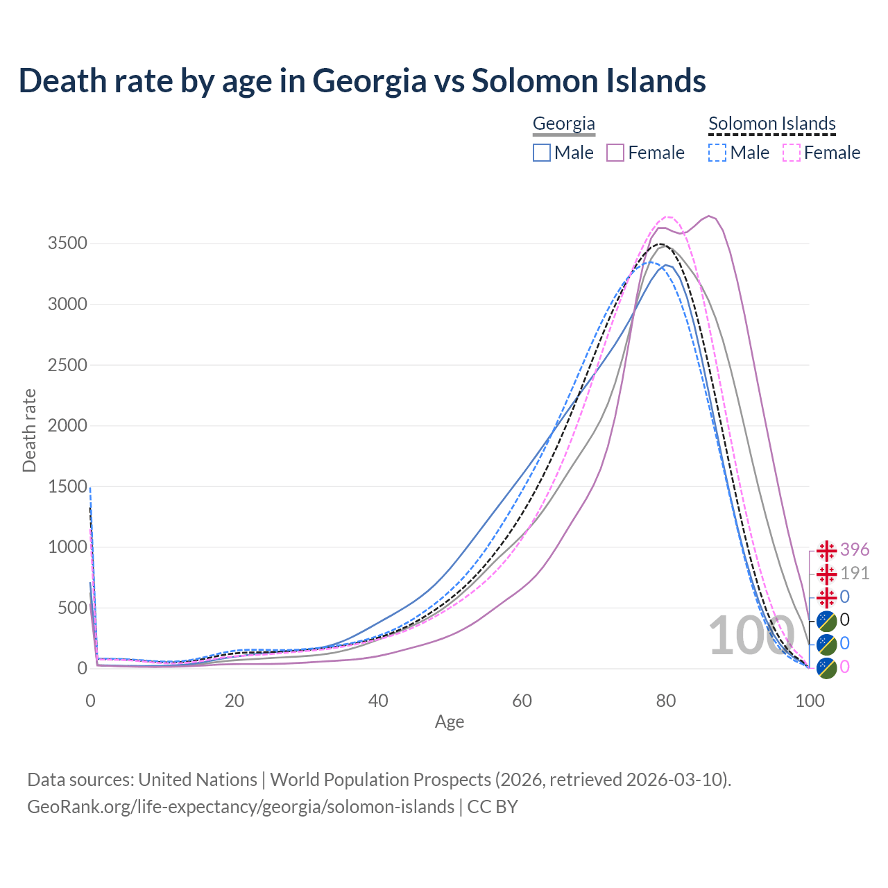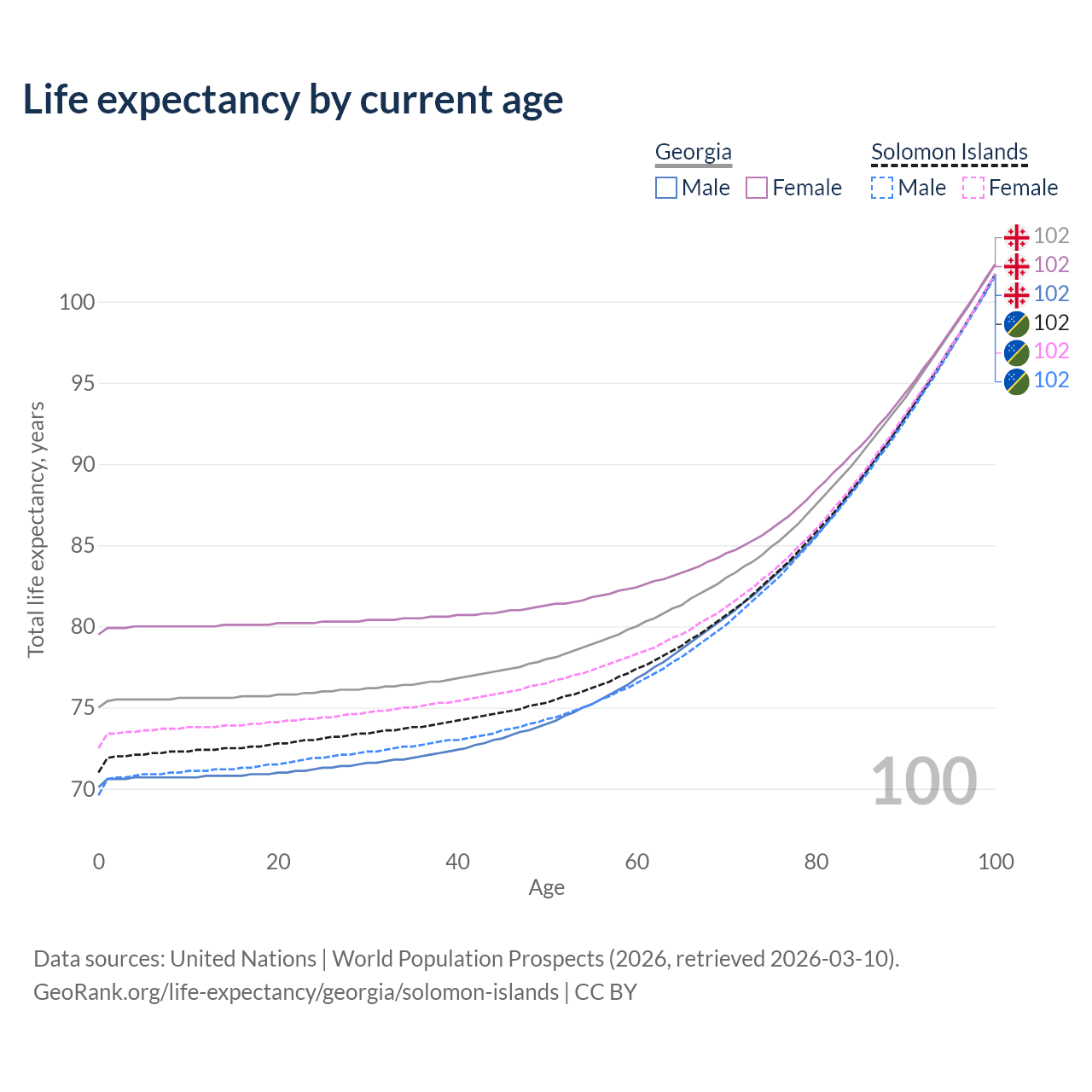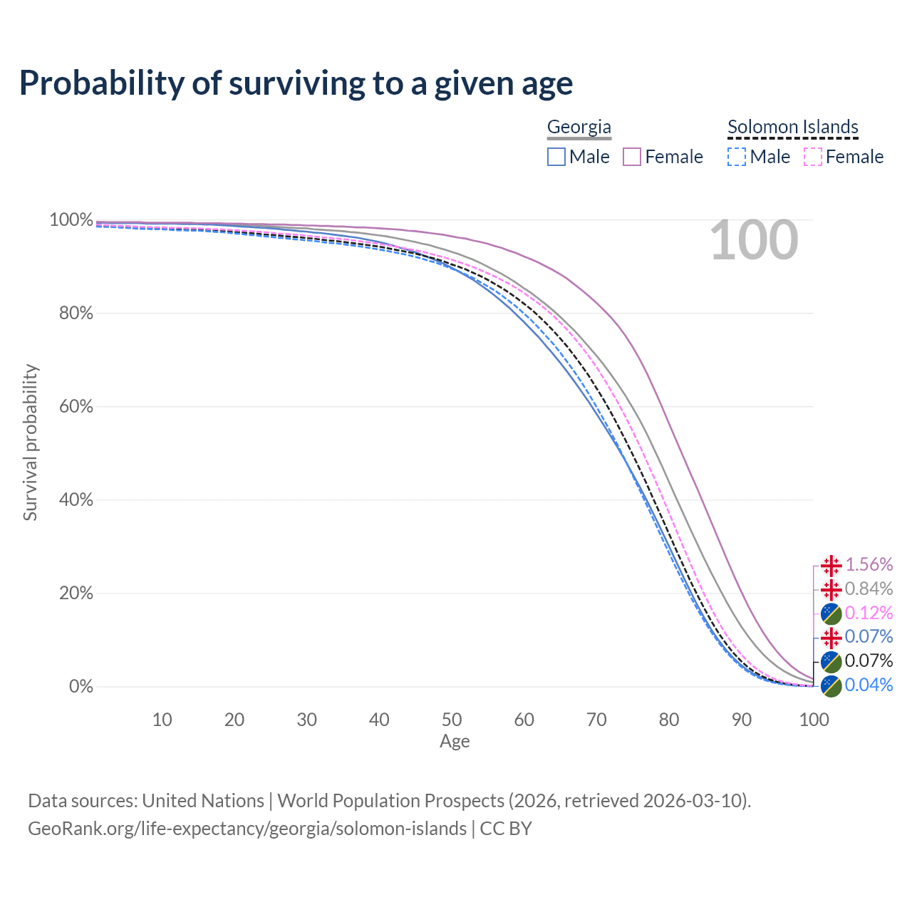 This life expectancy calculator shows the odds of living to 100, 95, 90, and below based on current age for both males and females in Georgia and the Solomon Islands, along with mean and median age of death. The calculations are based on the 2026 life tables (actuarial tables) from the UN World Population Prospects.