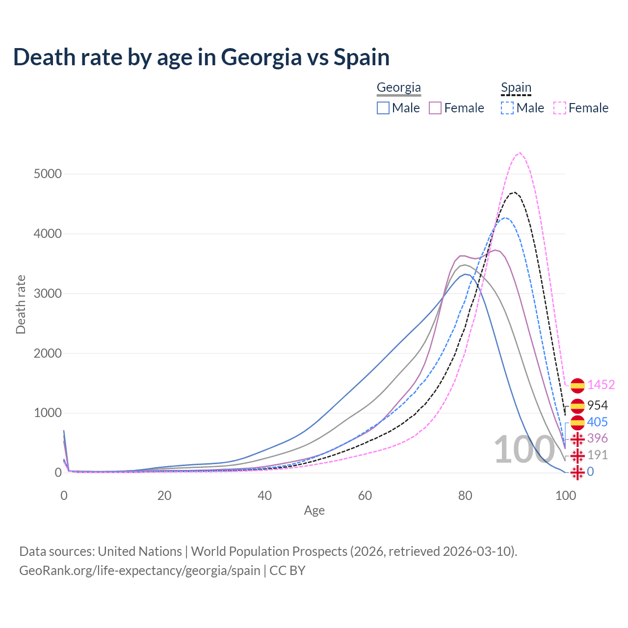 In Georgia, the most common age of death is 80, compared to 90 in Spain. The median age of death is 78.2 in Georgia and 87 in Spain, meaning only half of each cohort is expected to live past that age.