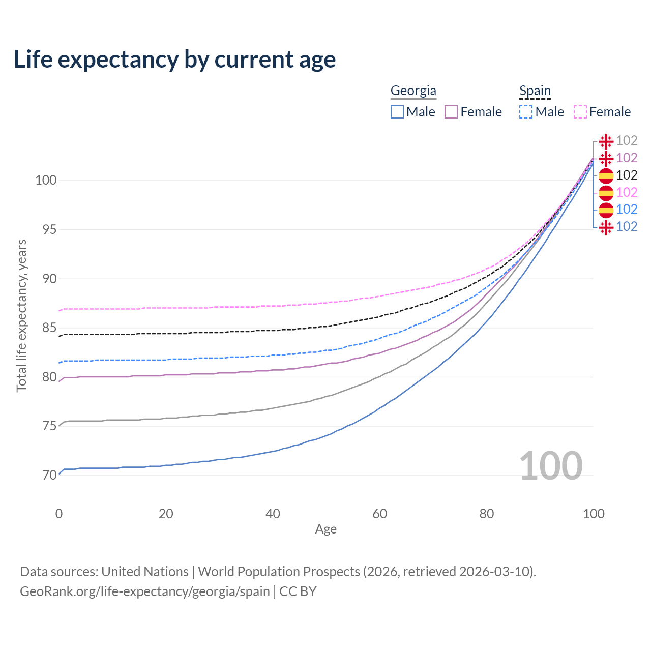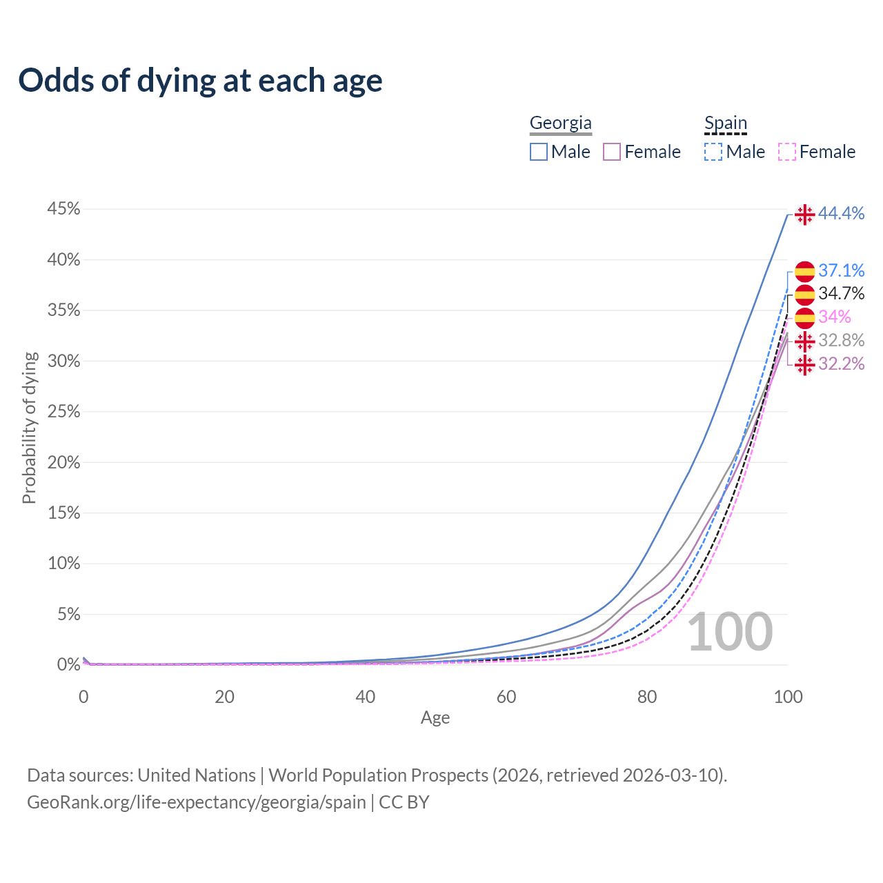 This life expectancy calculator shows the odds of living to 100, 95, 90, and below based on current age for both males and females in Georgia and Spain, along with mean and median age of death. The calculations are based on the 2026 life tables (actuarial tables) from the UN World Population Prospects.