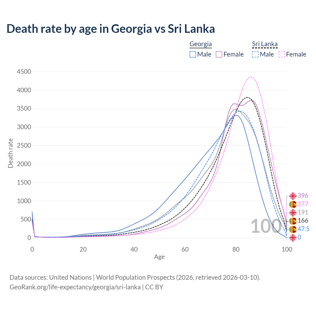 In Georgia, the most common age of death is 80, compared to 85 in Sri Lanka. The median age of death is 78.2 in Georgia and 81 in Sri Lanka, meaning only half of each cohort is expected to live past that age.