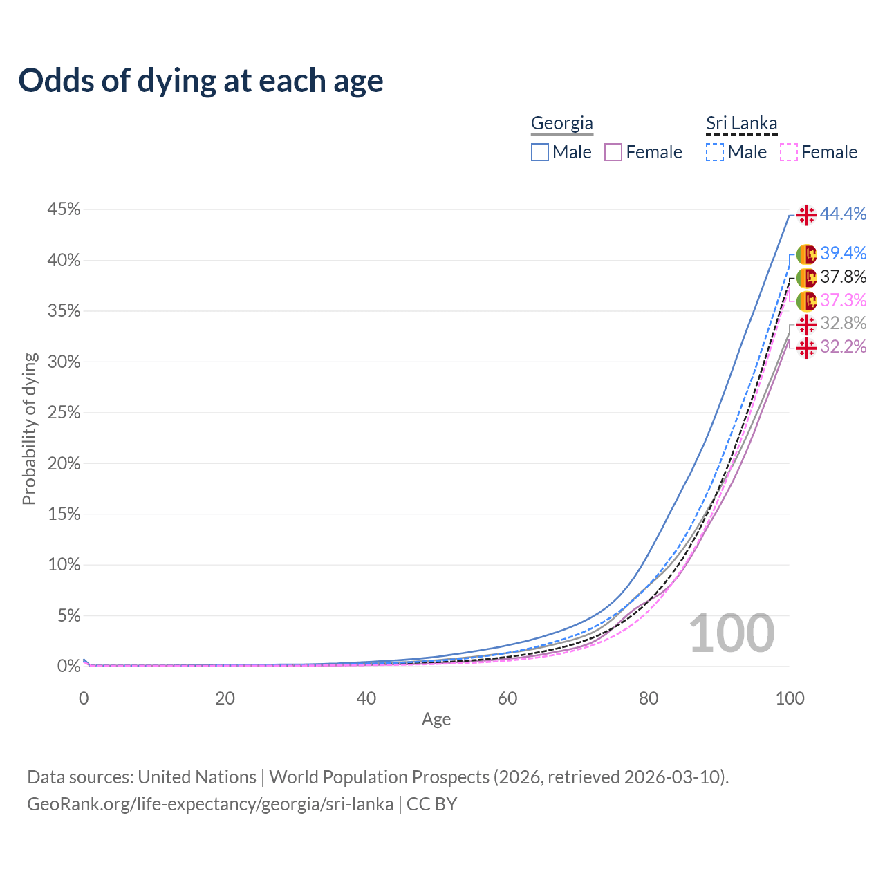 This life expectancy calculator shows the odds of living to 100, 95, 90, and below based on current age for both males and females in Georgia and Sri Lanka, along with mean and median age of death. The calculations are based on the 2026 life tables (actuarial tables) from the UN World Population Prospects.