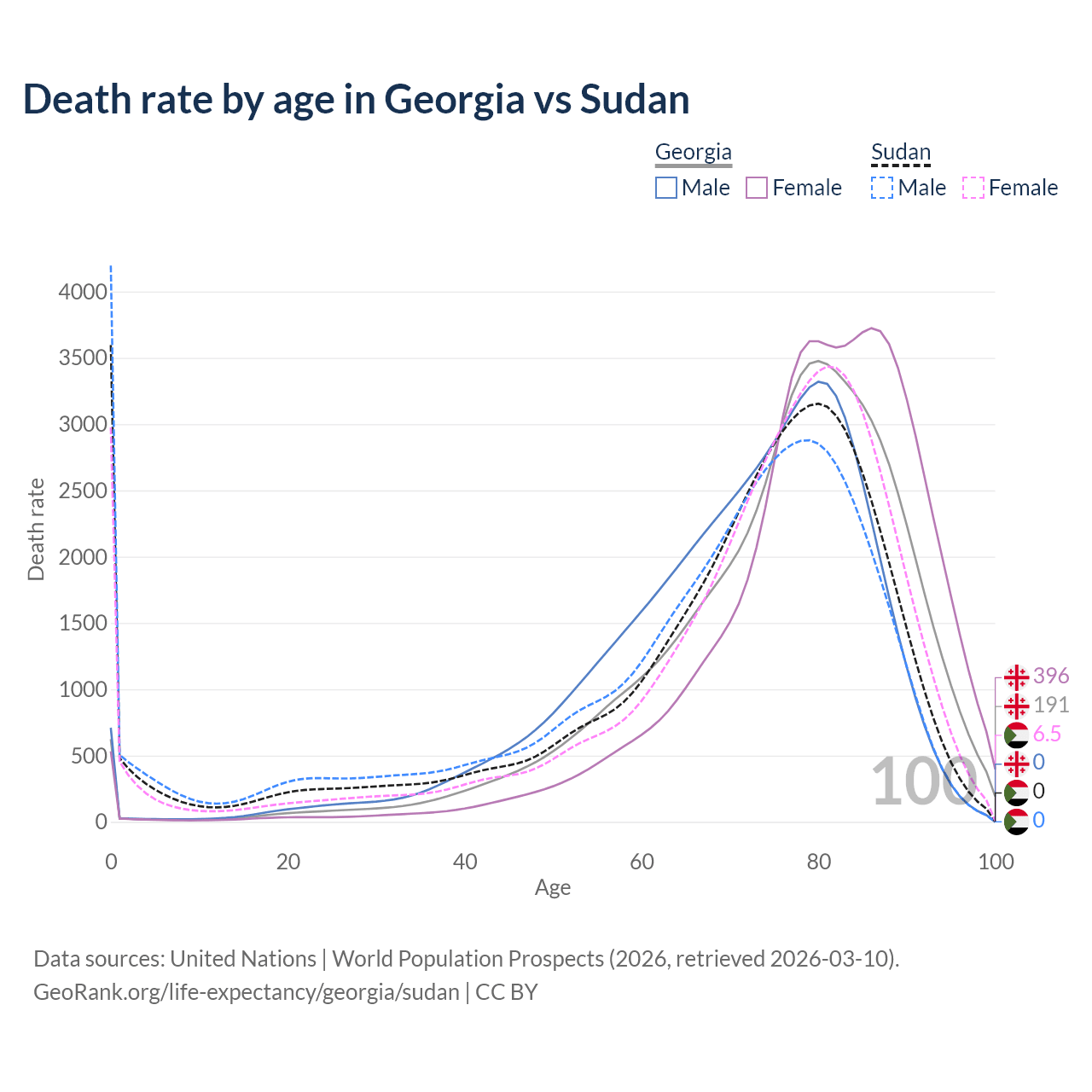 In Georgia, the most common age of death is 80, compared to 0 in Sudan. The median age of death is 78.2 in Georgia and 74.1 in Sudan, meaning only half of each cohort is expected to live past that age.