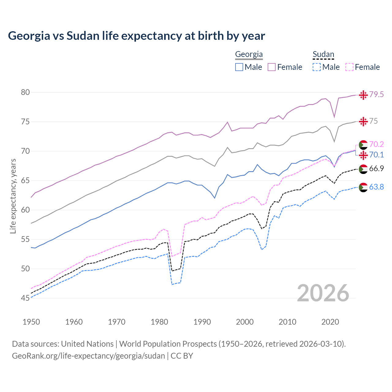 The average life expectancy at birth is 75 years in Georgia vs 66.9 in Sudan. Georgia is ranked 96/197 by life expectancy, and Sudan is 160/197. In Georgia, the life expectancy is 70.1 years for males and 79.5 years for females. In Sudan, it's 63.8 years for males and 70.2 years for females.
