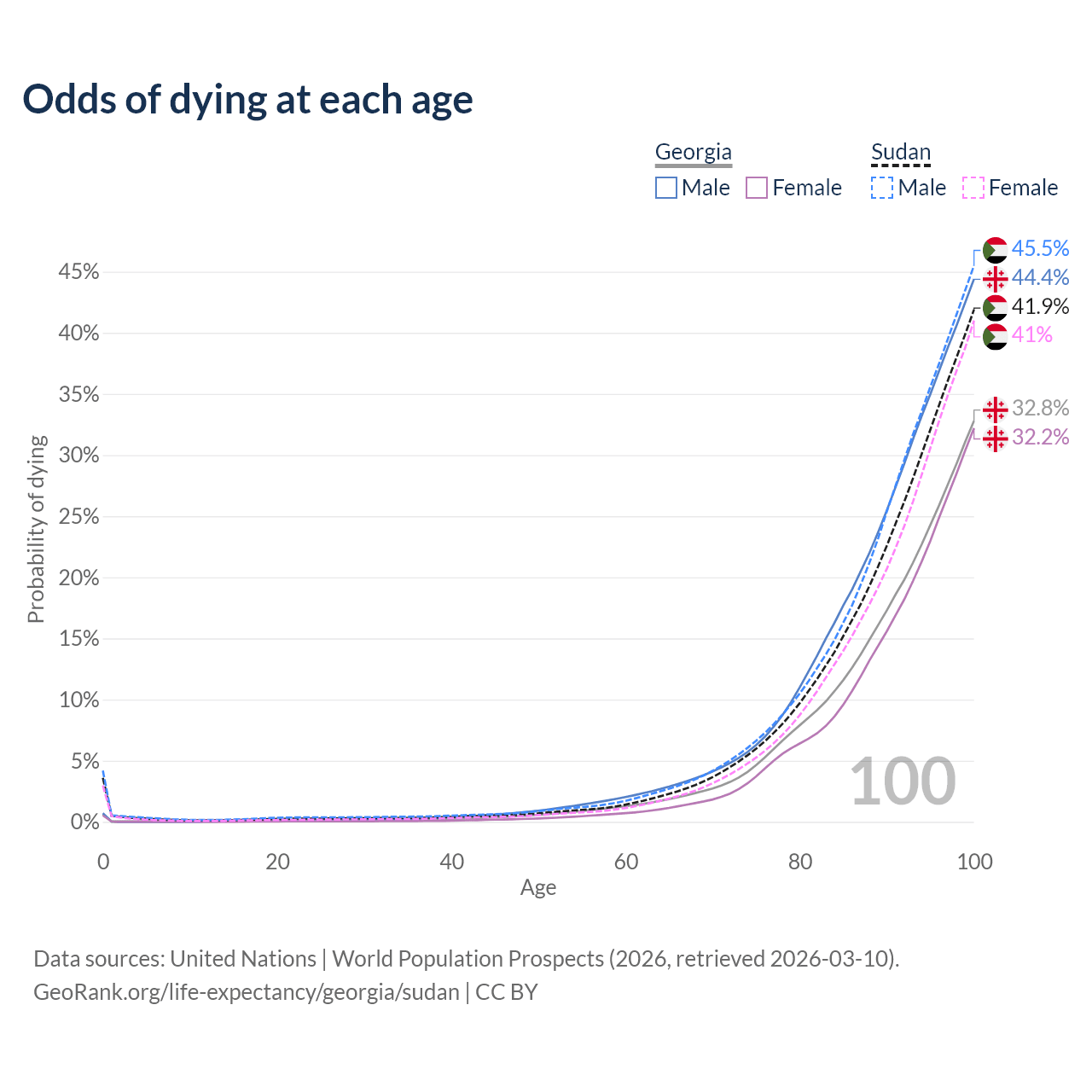 This life expectancy calculator shows the odds of living to 100, 95, 90, and below based on current age for both males and females in Georgia and Sudan, along with mean and median age of death. The calculations are based on the 2026 life tables (actuarial tables) from the UN World Population Prospects.