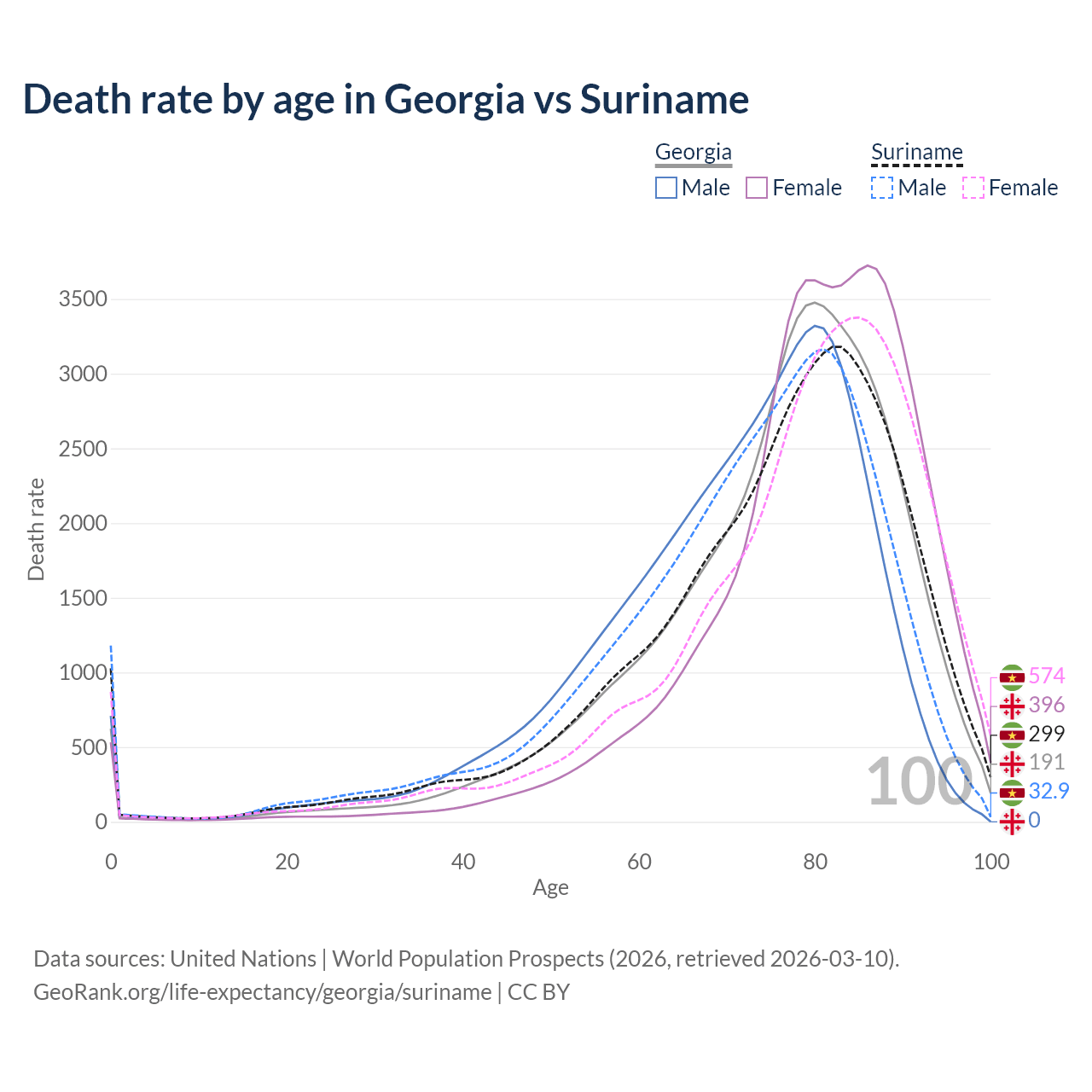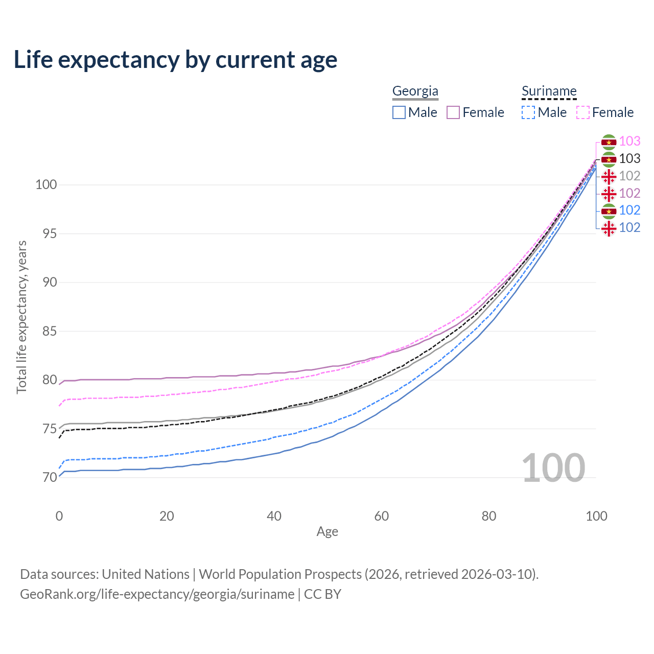 This life expectancy calculator shows the odds of living to 100, 95, 90, and below based on current age for both males and females in Georgia and Suriname, along with mean and median age of death. The calculations are based on the 2026 life tables (actuarial tables) from the UN World Population Prospects.
