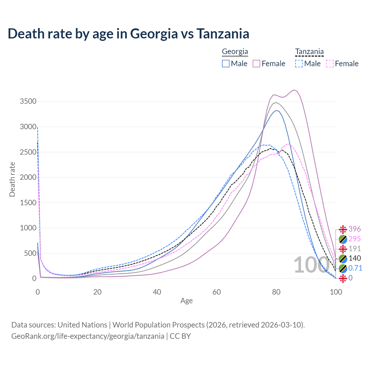 In Georgia, the most common age of death is 80, compared to 0 in Tanzania. The median age of death is 78.2 in Georgia and 72.6 in Tanzania, meaning only half of each cohort is expected to live past that age.
