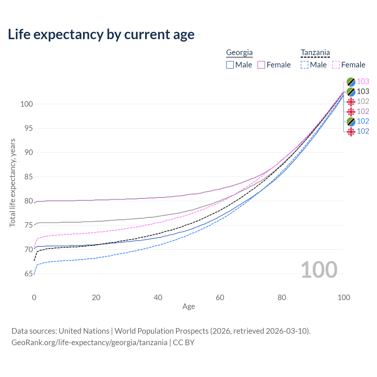 This life expectancy calculator shows the odds of living to 100, 95, 90, and below based on current age for both males and females in Georgia and Tanzania, along with mean and median age of death. The calculations are based on the 2026 life tables (actuarial tables) from the UN World Population Prospects.
