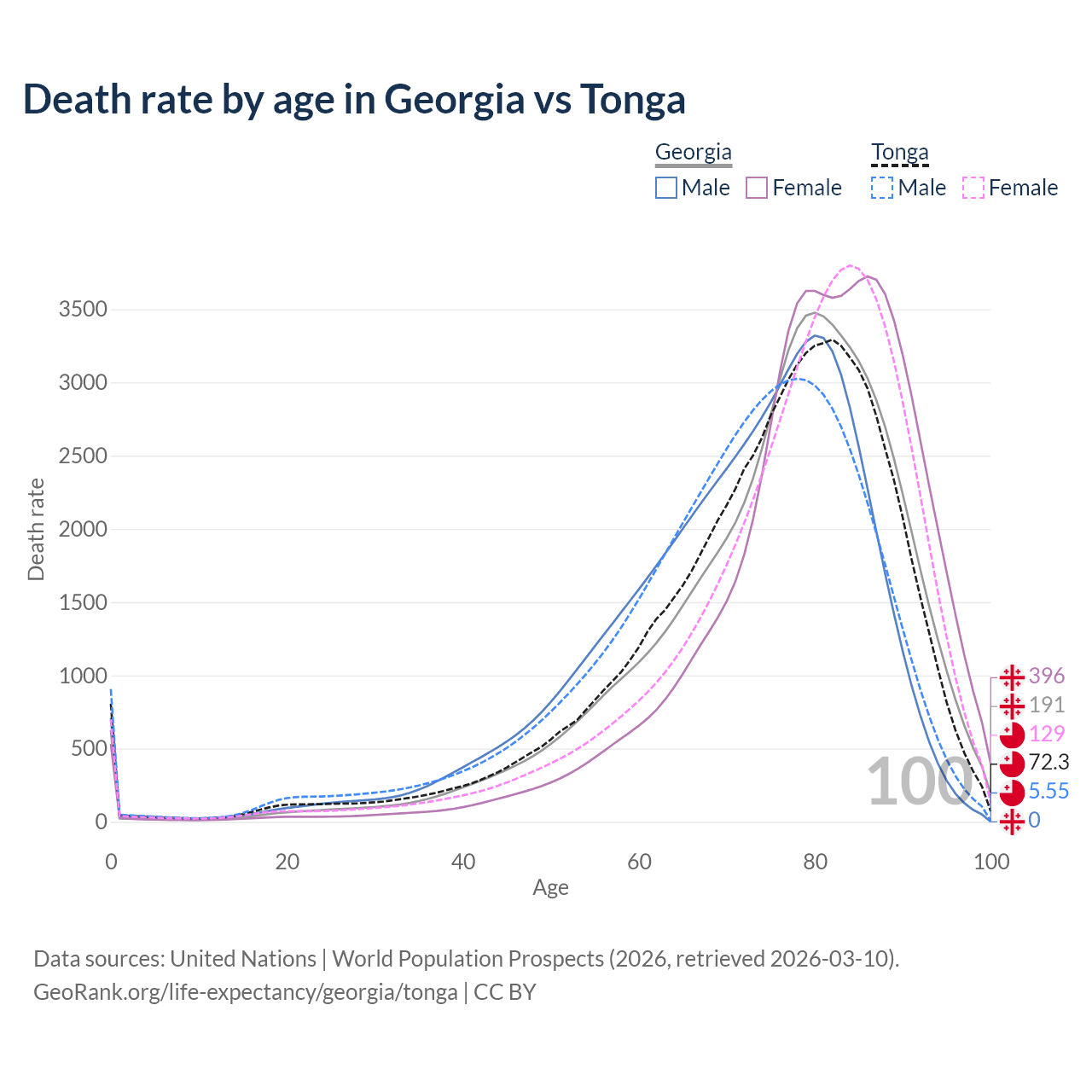 In Georgia, the most common age of death is 80, compared to 82 in Tonga. The median age of death is 78.2 in Georgia and 77 in Tonga, meaning only half of each cohort is expected to live past that age.