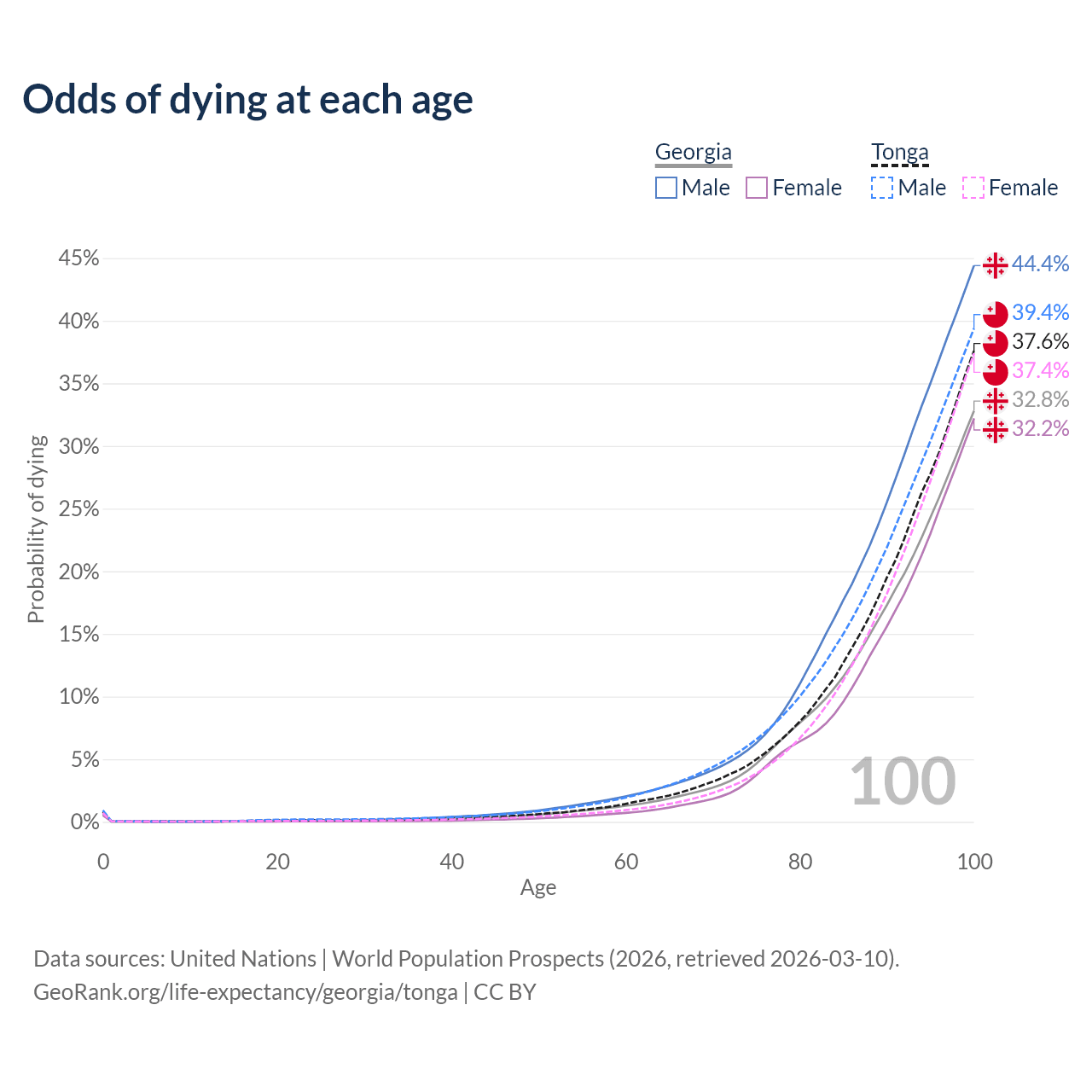 This life expectancy calculator shows the odds of living to 100, 95, 90, and below based on current age for both males and females in Georgia and Tonga, along with mean and median age of death. The calculations are based on the 2026 life tables (actuarial tables) from the UN World Population Prospects.