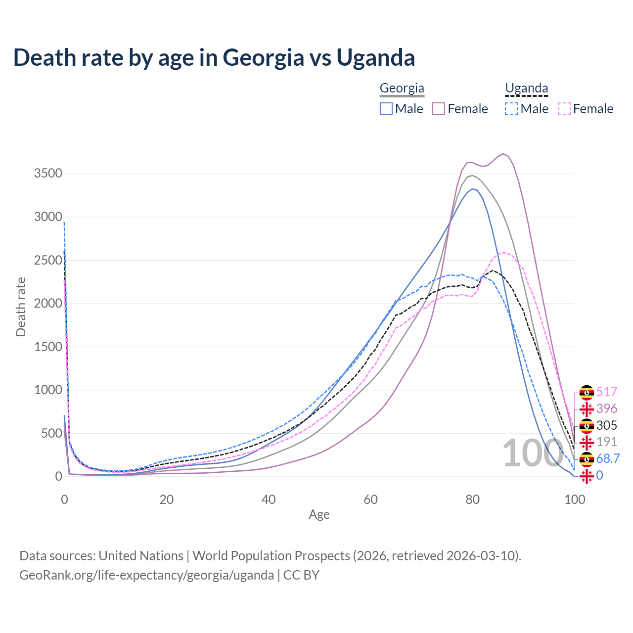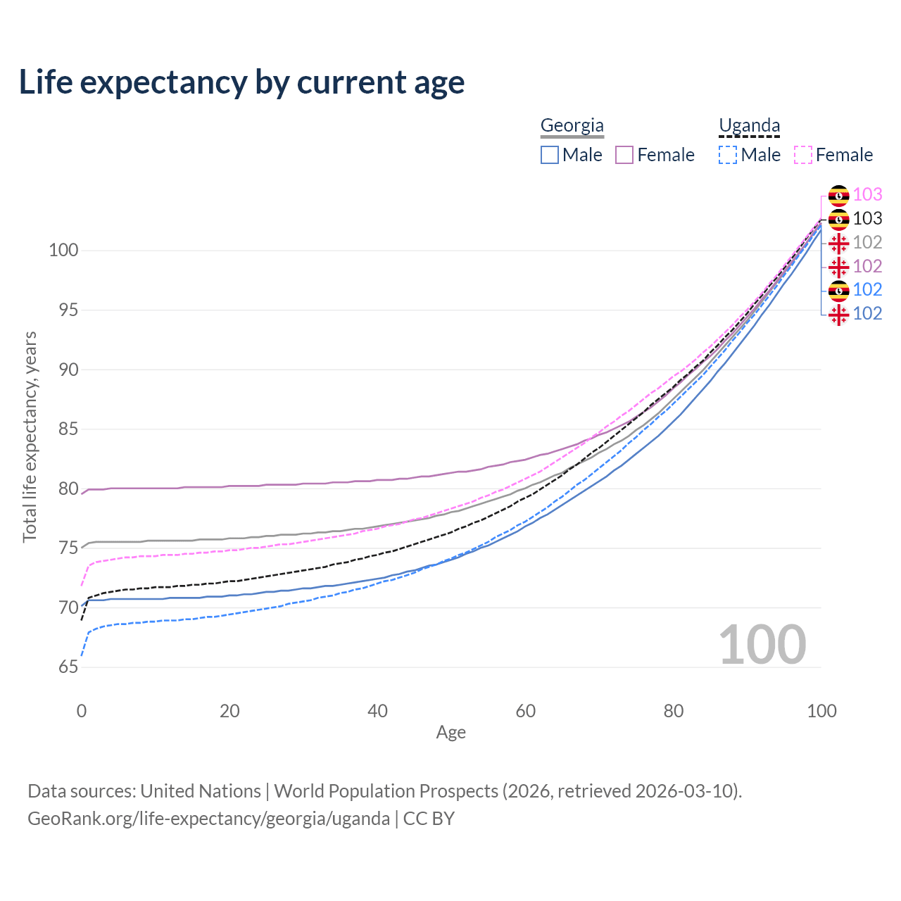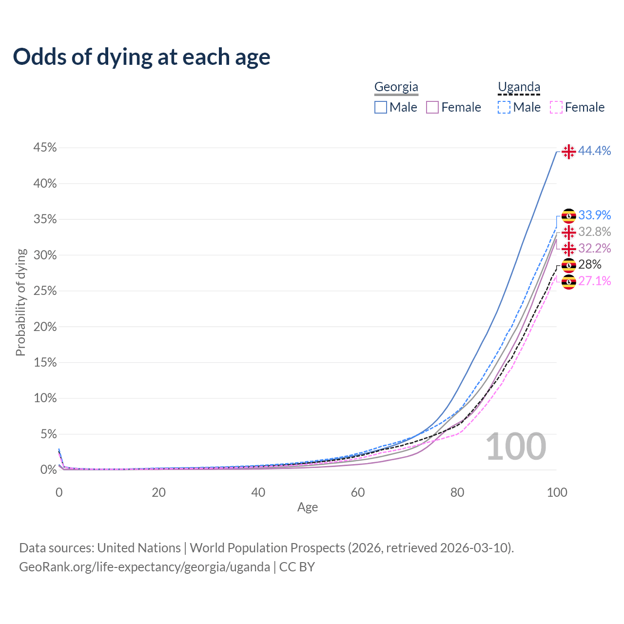This life expectancy calculator shows the odds of living to 100, 95, 90, and below based on current age for both males and females in Georgia and Uganda, along with mean and median age of death. The calculations are based on the 2026 life tables (actuarial tables) from the UN World Population Prospects.