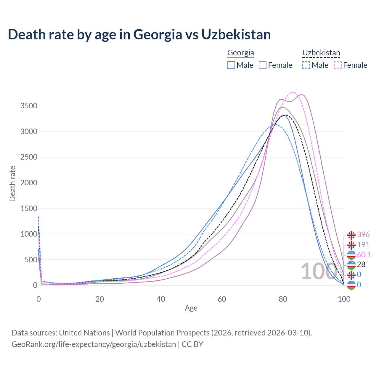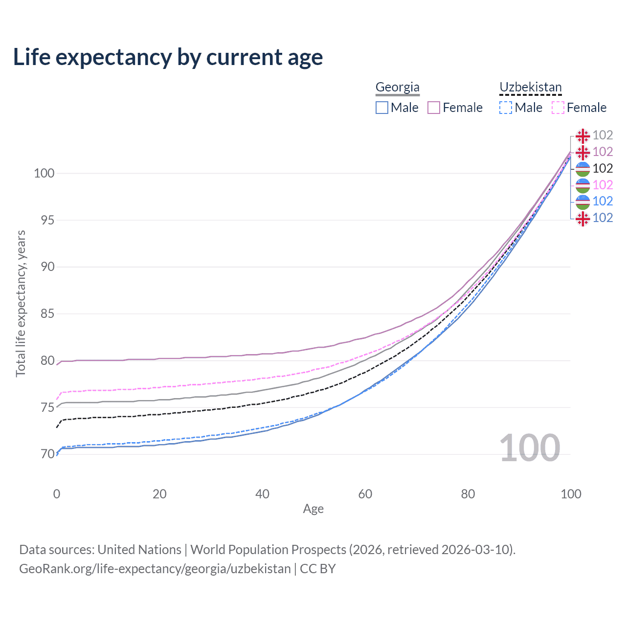 This life expectancy calculator shows the odds of living to 100, 95, 90, and below based on current age for both males and females in Georgia and Uzbekistan, along with mean and median age of death. The calculations are based on the 2026 life tables (actuarial tables) from the UN World Population Prospects.
