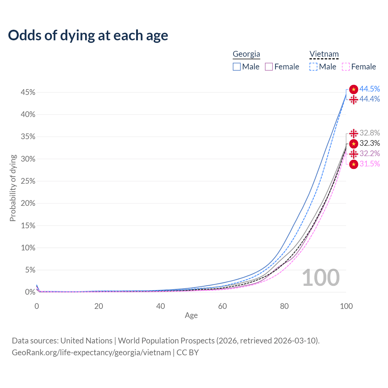 This life expectancy calculator shows the odds of living to 100, 95, 90, and below based on current age for both males and females in Georgia and Vietnam, along with mean and median age of death. The calculations are based on the 2026 life tables (actuarial tables) from the UN World Population Prospects.