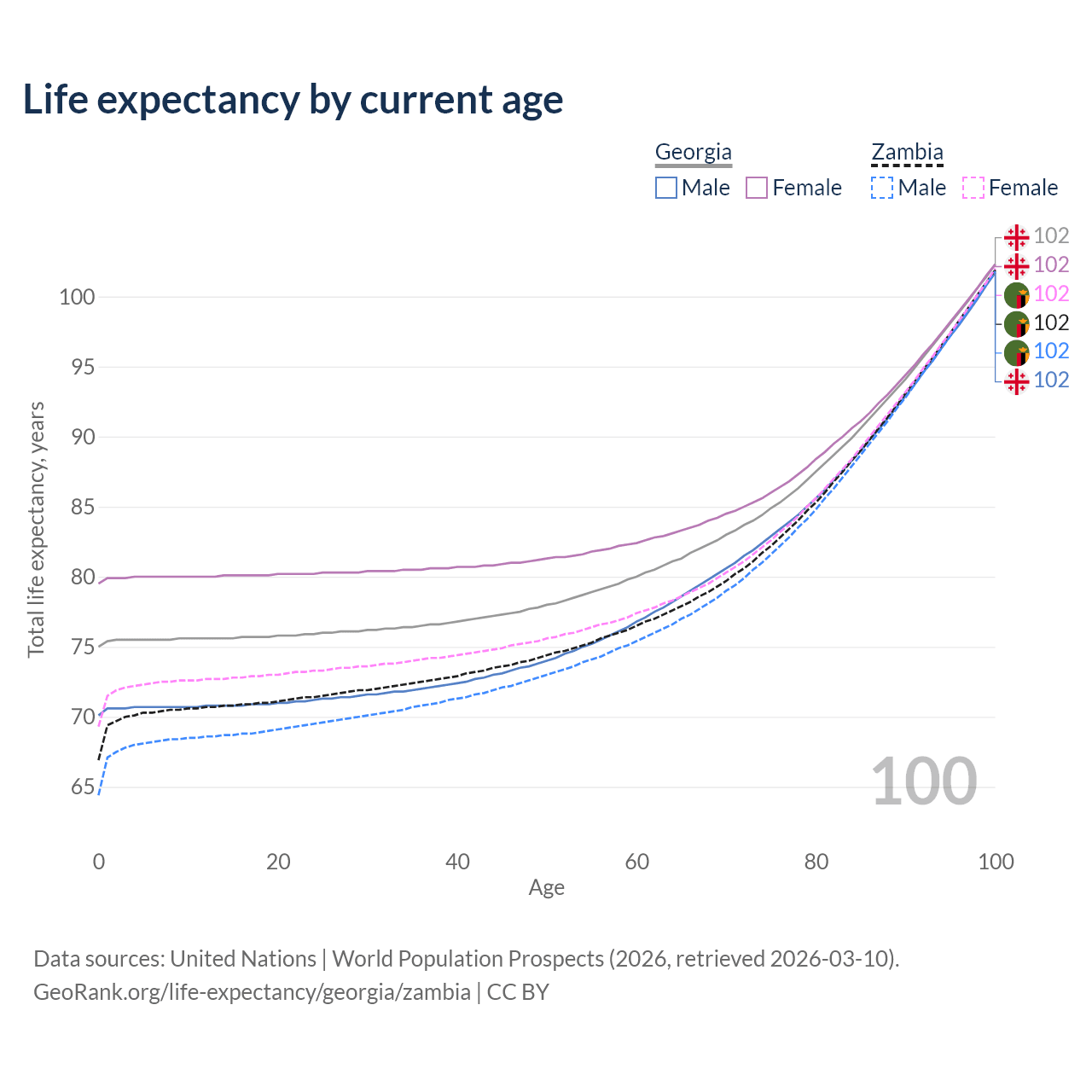 This life expectancy calculator shows the odds of living to 100, 95, 90, and below based on current age for both males and females in Georgia and Zambia, along with mean and median age of death. The calculations are based on the 2026 life tables (actuarial tables) from the UN World Population Prospects.