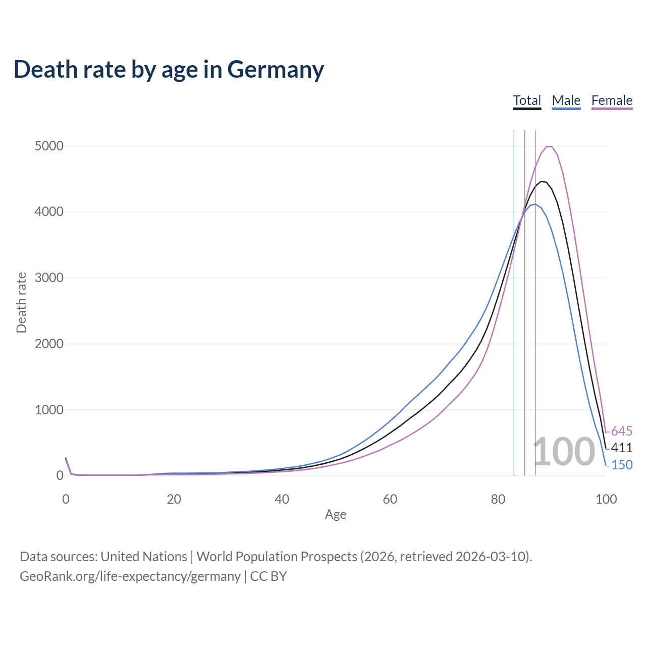 This life expectancy calculator shows the odds of living to 100, 95, 90, and below based on current age for both males and females in Germany, along with mean and median age of death. The calculations are based on the 2026 life tables (actuarial tables) from the UN World Population Prospects.